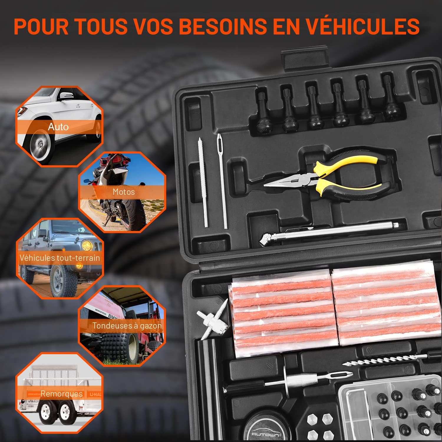 Kit Crevaison Pneu Voiture 102 Pièces Kit Dépannage Pneu Voiture Moto Kit Réparation Pneus Tubeless - Pistolet + Bouchons - Pour Voiture, Moto, SUV, Camping-car Kit Dépannage Pneus Tubeless Kit Dépannage Crevaison Voiture Moto Kit de réparation de pneus | 54 pièces 3D Lettering Reif Reparaturset, 32 Stück Reifreparaturset Heavy Duty Flat Re Il est de notre responsabilité d'assurer la qualité du produit. Kit de réparation de pneus 100 pièces universel avec boîte convient aux voitures/camions/motos... Si vous avez des questions sur le kit de réparation AUTOWN, veuillez nous contacter. 【🔨ALL-IN-ONE REPAIR KIT】 Autown 102pcs kit de réparation de pneus contient tout ce qui est nécessaire pour réparer les pneus sans chambre à air, peut facile et rapide à réparer pour la plupart des véhicules, pas besoin de retirer les pneus de la jante. 【🔨QUICK ACTION】 Nous nous soucions du sens de l'utilisation de chaque client. Kit de réparation de pneus, 102 pièces, kit de réparation de pneus pour voiture, kit de réparation de pneus universel pour réparer les crevaisons et boucher les trous, bouchons de réparation de pneus