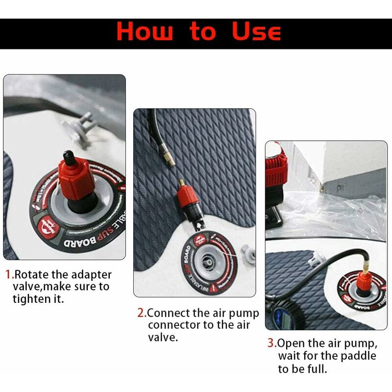 Description de base du produit : Nom: Adaptateur de Buses de Valve d'air, Matériel: Plastique, La couleur: Noire, Poids: 50g Polyvalent : notre adaptateur pompe kayak est adapté à une variété de sports nautiques, y compris les kayaks, les aéroglisseurs, les planches de surf, les bateaux gonflables, etc. J'espère que vous aimez notre adaptateur de gonflable de valve. Largement utilisé : notre adaptateur de gonflable de valve couvre la plupart des planches à pagaie, des bateaux gonflables, des bateaux d'assaut, des lits gonflables, des bateaux gonflables, des kayaks, etc. Adaptateur de Valve pour Pompe à air Sup, 1 kit, Accessoire de Pompe à air pour Stand up Paddle Board Gonflable, canoë, Kayak, Chaise Longue, Bateau pneumatique, Adaptateur de Pompe Haute Pression Le forfait comprend1 x Adaptateur de Kayak Facile à utiliser : ce adaptateur de pompage est robuste et durable, peut être rapidement connecté à votre valve de gonflage, a de fortes performances d'étanchéité et empêche efficacement les fuites d'air. Kit d'adaptation pour kayak 2 pièces, valve d'adaptation Sup... Si vous avez des questions pendant le processus d'achat, n'hésitez pas à nous contacter., Bon shopping ! Equipé de 4 buses d'air différentes, vous pouvez le combiner avec différentes valves d'air selon vos besoins pour assurer la compatibilité avec différents produits gonflables. pour répondre à vos différents besoins en matière de bateaux gonflables en plein air. Connecteur Pompe SUP 5 Pièces Adaptateur De Valve D'air,Adaptateur De Pompe Sup Connecteur 4 En 1 Gonflable Il comprend 4 adaptateurs différents, permettant de répondre aux besoins de gonflage de la plupart des équipements. Économique et pratique, cet adaptateur facilite la connexion entre la pompe manuelle et les valves, sans nécessiter d'outils supplémentaires Nous attachons toujours une grande importance à la qualité des produits et à l'expérience du service.