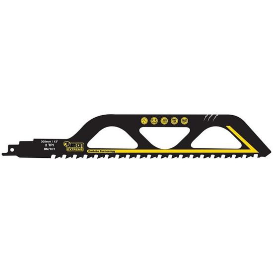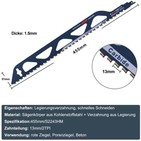 Lame Compatible Scie Sabre Sawzall Lame De Scie Sabre,pierre De Scie Sabre,en Carbure De Tungstène,acier Métallique,bois,pierre De Coupe Fonte Acier Inox Les lames de scie alternative en métal ont également une longue durée de vie et coupent rapidement, épaisses et droites. [Large application]Convient pour la découpe : béton cellulaire, brique rouge, fibrociment (225 mm), plastique renforcé de fibre de verre, résine époxy (150 mm), convient aux abrasifs PQ 3 LAMES SCIE SABRE Carbure Métal 150mm BOSCH Idéale pour les chantiers : Haute productivité et grande ténacité – coupe facilement les matériaux sur lesquels les lames en bimétal échouent (acier inoxydable, vis en acier allié), parfaite pour les travaux lourds sur chantier. Lame de Scie Sabre à Denture au Carbure de Tungstène 240mm DT2420-QZ... Large compatibilité : Lame de scie sabre en carbure de 150 mm, 8 DPI, avec manche universel de 1/2 pouce – compatible avec la plupart des marques de scies sabre sur le marché. Adaptée aux travaux de démolition : Conception 8 DPI (dents par pouce) pour tous types de métaux (ex. acier allié, acier inoxydable, acier d'armature) lors des travaux de démolition. Durée de vie extra-longue : Lames de scie sabre en carbure : 30 fois plus longue durée de vie que les lames en bimétal, résistantes à l'usure et stables à long terme.