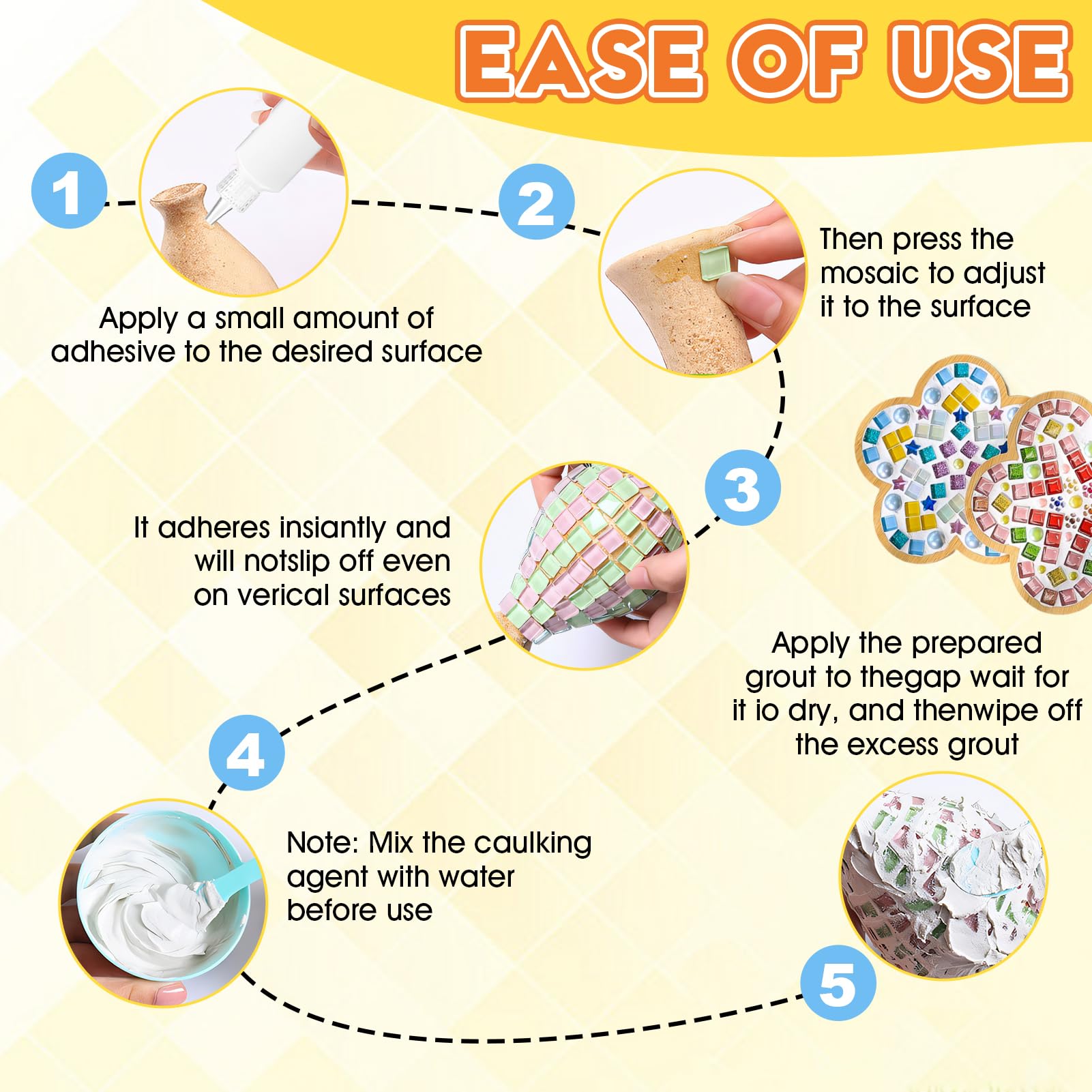Colle et joint 2 en 1 pour mosaïque mur et sol, 10 kg, blanc - - Dispatc HAUTE RÉSISTANCE DE LIAISON : Mosaique loisir creatif spécialement conçu pour les mosaïques, il peut adhérer fermement aux mosaïques de différents matériaux tels que le verre, la céramique, le métal, etc. Carreaux Mosaïque Verre Fizdoqg Kit Mosaique Enfant 6 PCS Autocollants Mosaïques Pour Enfants Mosaïque Art Kit Créatif Mosaïques Kits D'artisanat Loisirs Créatifs à Thème Pour Enfants Cadeaux Filles Garçons Kits De Mosaïque Création Cadres Pots Miroirs Le coulis pour mosaïque est utilisé pour combler les espaces entre les mosaïques afin d'éviter l'humidité, les taches et d'améliorer l'esthétique. COLLE-JOINT O'COLOR MOSAIQUE COLORIS BLANC POT 250GR Prix, Promotions, Disponibilité Code Référence Tarif Réd Prix 604466 0340 5,61 0% 5,61 Description... ENSEMBLE DE MOSAÏQUE : Vous recevrez 200 g Mosaique Carrelage 100 g de coulis de mosaïque 22 ml de Colle Mosaique*2, adaptés à divers matériaux de... Nettoyer avec un chiffon humide après 24 heures et éviter tout contact avec l'eau pendant une semaine. de sorte que les fragments de mosaïque peuvent rester stables pendant longtemps et ne tombent pas facilement. UTILISATIONS VARIÉES : Kit mosaique idéal pour les projets d'art et d'artisanat, la décoration de la maison et du jardin, peut créer de magnifiques cadres photo, des pots de fleurs, des dessus de table, des miroirs et plus encore. pour créer des effets artistiques personnalisés., Instructions: 1., Nettoyez la surface : avant utilisation, assurez-vous que la surface de contact est propre, sèche et exempte de poussière ou d'huile pour améliorer l'effet d'adhérence., 2., Appliquez de la colle ou appliquez-la directement au dos de la mosaïque, collez la pierre de mosaïque selon le motif conçu, appuyez doucement pour vous assurer qu'elle adhère fermement et laissez reposer 24 heures pour que la colle durcisse complètement., 3., Mélangez 100 grammes de poudre à jointoyer avec une quantité appropriée d'eau jusqu'à obtenir un mélange semblable à celui d'un dentifrice (sans particules) et pressez la pâte dans les interstices de la mosaïque pour vous assurer qu'ils sont bien remplis., 4., Lorsque le calfeutrage est semi-sec (environ 15 à 30 minutes), essuyez l'excédent de coulis sur la surface avec une éponge ou un chiffon humide., Conseils utiles : 1., Conserver dans un récipient fermé dans un endroit frais et sec, à l'abri du feu et de la lumière directe du soleil. MODE D'EMPLOI : Appliquer la colle - Coller la Mosaique (appuyer uniformément) - Laisser reposer pour solidifier. Nom du produit : kit mosaique Mots-clés : kit mosaique L'ensemble comprend : 200 g mosaique carrelage + 100 g de coulis de mosaïque + 22 ml *2 colle mosaique effet: Fonction de décoration de collage : l'ensemble de mosaïque peut être librement collé dans divers motifs, adapté à la décoration de cadres photo, de pots de fleurs, de bureaux, de miroirs, etc.