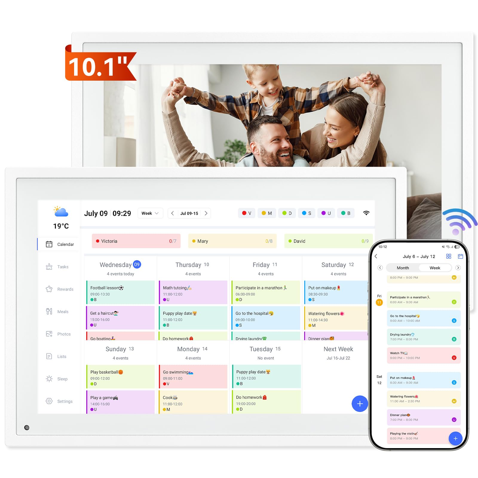 Calendrier numérique de mise à niveau, calendrier numérique Il est en prise en charge de ICloud, de la prise en charge de Calendar, de la prise en charge des Outlook, de la prise en charge de Cozi et de la prise en charge de Yahoo, Calendar +2 VBESTLIFE 10.1 "Calendrier Numérique Tableau De Corvée, écran Calendrier Intelligent 10.1 Pouces Fonctionnalité puissante: branchez simplement l'appareil, connectez-vous à Wi Fi et synchronisez votre calendrier pour les mises à jour automatiques. L'écran tactile IPS HD de 10,1 pouces offre un moyen attrayant de gérer les horaires et de partager des moments, garantissant que la planification de votre vie... Calendrier numérique 10,1 pouces tableau de corvée - écran tactile interactif, Smart Famil... Planification des tâches et des repas: avec la compatibilité des applications mobiles, vous pouvez facilement ajouter, modifier et gérer les activités, les tâches et les plans de repas directement à partir de votre téléphone. Écran tactile HD de 10,1 pouces: Ce cadre numérique WiFi de 10,1 pouces possède un écran tactile IPS de résolution HD 1280x800, offrant des visuels incroyables sous n'importe quel angle. Restez connecté avec des êtres chers: mettez instantanément à jour vos moments de vie et envoyez des salutations immédiates ou programmées pour encadrer, en vous gardant connecté avec la famille, en particulier ceux qui vivent loin. Son interface à écran tactile intuitif simplifie l'organisation des tâches et des horaires pour chaque membre de la famille, faisant de la gestion quotidienne de l'activité. Que ce soit la vérification de votre horaire, la gestion des tâches ou la navigation sur des photos, tout est présenté avec une clarté exceptionnelle, améliorant votre expérience utilisateur globale. Calendrier en ligne intelligent: Ce calendrier innovant de la maison intelligente mélange parfaitement les fonctions d'un planificateur numérique et d'un cadre photo, offrant des vues mensuelles, quotidiennes et hebdomadaires ainsi que des listes de corvée et de faire.