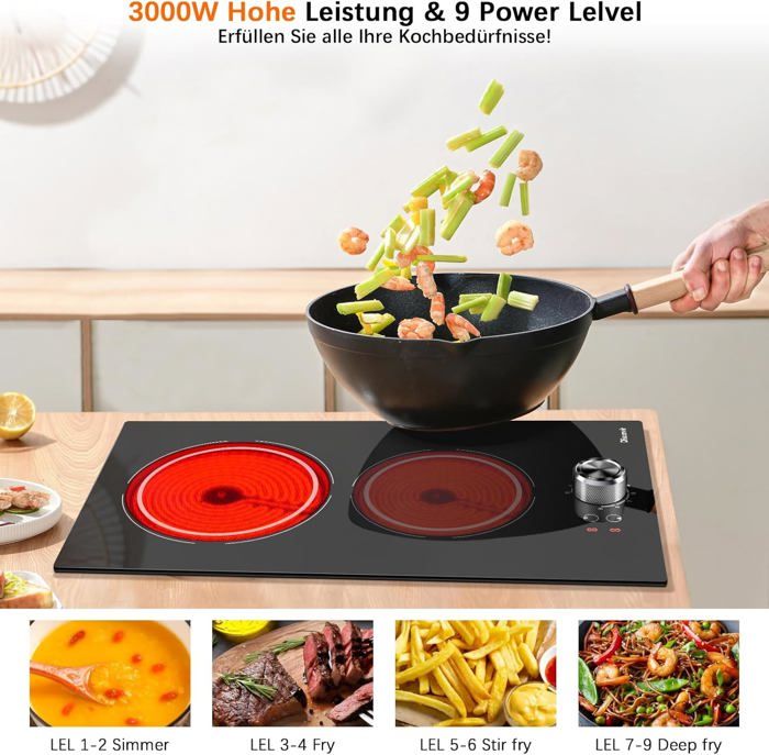 Deux foyers, deux usages : la zone de 1800W chauffe rapidement pour saisir ou faire bouillir, tandis que celle de 1200W est parfaite pour mijoter en douceur. Plaque de Cuisson Vitrocéramique 2 Feux 3000W, Table de Cuisson 🍳 Compatibilité totale avec vos ustensiles actuels Cette plaque de cuisson électrique 2 zones fonctionne avec tous les types de casseroles à fond plat : inox, fonte, aluminium, céramique, cuivre… Aucune nécessité de renouveler vos équipements ! Plaque Vitroceramique 2 Foyers Nardea Plaque Vitrocéramique 2 Feux Encastrable, 3000W Plaque Cuisiniere Vitrocéramique Fonctions essentielles, commandes claires, design moderne – tout est là pour cuisiner en toute confiance, même dans les petits espaces. Une plaque de cuisson électrique 2 foyers qui s’adapte à toutes vos envies culinaires. Nornward Plaque Vitrocéramique 2 Feux Encastrable De 3000W, Plaque De... Un simple coup de chiffon humide suffit pour retrouver une plaque impeccable après utilisation. 🔥 Chauffage rapide à 9 niveaux avec contrôle tactile Grâce à ses 9 niveaux de puissance et son contrôle par glissement tactile, vous ajustez la chaleur avec précision pour mijoter, saisir ou réchauffer. Klarstein EasyCook Domino Plaque de cuisson vitrocéramique 2 feux 3000W... Que vous cuisiniez pour une personne ou pour deux, elle s’adapte parfaitement aux cuisines compactes, appartements, studios ou camping-cars. Profitez d’une cuisson fiable, où que vous soyez. Idéal pour une utilisation sûre au quotidien. Description du produit Une plaque de cuisson vitrocéramique 2 foyers compacte et intuitive, conçue pour simplifier la cuisine au quotidien. 🧽 Surface vitrée facile à nettoyer Son verre microcristallin noir lisse résiste à la chaleur et aux rayures.