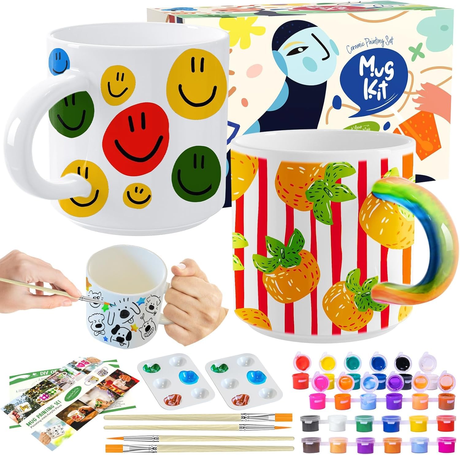 Peinture Sur Céramique Kit Roaxkois - Tasses, Pinceaux Et Peintures Inclus Set Créatif Avec Pinceaux Specifications: Cup material: ceramic Cup color: white Acrylic paint: red, yellow, blue, green, white and black Cup size: about 3.07 x 3.54 inches/ 7.8 x 9 cm... Kits peinture sur céramique - Céramicafé Geneviève Votre moment de détente : que ce soit un café du dimanche, une soirée créative entre amis ou un projet familial, peindre les tasses crée des moments de détente et de bien-être. Parfait pour des heures de détente ou pour une expérience commune. Tout ce dont tu as besoin : le kit contient tout ce dont tu as besoin pour te lancer immédiatement : une tasse en céramique de qualité, des couleurs vives et différents pinceaux. Le guide d'inspiration inclus te donnera des idées créatives pour ton design Un design qui dure dans le temps : une fois cuit au four, votre design est conservé de manière permanente, pour une tasse non seulement belle à voir, mais aussi en mesure d'affronter sans problème la vie quotidienne. Dessinez votre tasse : que ce soit une phrase préférée ou un motif coloré, avec cet ensemble, vous pouvez créer en un instant une tasse personnalisée qui reflète votre créativité. À vos besoins : notre ensemble comprend 2 tasses en céramique de haute qualité, des couleurs vives, des pinceaux et des instructions de peinture. Roaxkois Set de peinture en céramique - Set d'artisanat créatif en céramique avec couleurs, pinceaux et instructions - Set de peinture pour la tasse parfait pour les cadeaux individuels et les loisirs