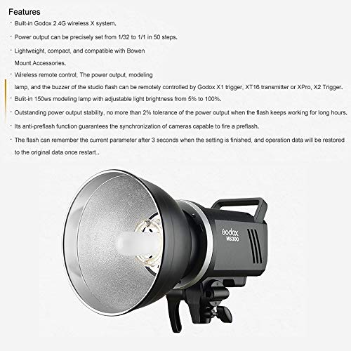 La puissance de sortie peut être réglée avec précision de 1/32 à 1/1 en 50 étapes. Système GODOX sans fil X 2,4 G : la sortie de puissance, la lumière de réglage et le buzzer du flash de studio peuvent être contrôlés à distance par le déclencheur GODOX X2, les émetteurs GODOX 16 ou XPro, XPro II., 16 groupes, 32 canaux La luminosité de la lampe de réglage de 150 W peut être réglée de 5 % à 100 %. Excellente stabilité des performances, pas plus de 2 % de fluctuations avec la même puissance. MS300V Kit Godox SK300II-V Flash De Studio, 300Ws Strobe Flash Avec COB LED Modeling Lampe 5700K, GN58 Studio Flash Temps De Recyclage 0,1-1,5s, 40 Niveaux De Flash 2.4G Sans Fil System Avec Connexion pour télécommande sans fil odox-Blitzgeräten, die über das integrierte Godox Wireless X System verfügen. Aazon.co: Godox S300-V Luz de flash de estudio ejorada 300Ws luz... 【Flash compact et portable】Léger, compact et avec support Bowens, avec réflecteur AD-R6, adapté pour le mariage, la photographie de portrait, le studio, l'enregistrement vidéo Description du produit Godox MS300 Flash de studio Puissance maximale : 300 W - Nombre de guides (m ISO 100) (avec réflecteur très efficace) : 58 - Température de couleur : 5600 ± 200 K - Tension de fonctionnement : AC110V-120V-60Hz//AC220-240V(50Hz) Leistungsaufnahme der Modellierlampe: 150ws Helligkeit der Modellierlampe:5%~100% Wiederaufladezeit:220V (0., 1~1., 3s)/110V(0., 1~1., 8s) Blitzdauer: 1/2000~1/800s Sicherung: F8AL 250 V 【Recyclage rapide et temps de flash】La tête offre des temps de recyclage de 0,1 à 1,8 secondes et des durées de flash de 1/2000 à 1/800 seconde. Température Couleur 5600K GODOX Ms300 - V Compact 300W Studio Flash Mise à Niveau De La Lumière De Réglage 2.4G Sans Fil X Système Gn58 5600k Monolithique Bowens Mount 0,1-1,3 Secondes Temps De Récupération Recyclage Rapide 0.1-1.8s Monolight - Godox - DP600III - 600W - GN80 - 5600K - Système sans Fil 2... 【Fonction Anti-Preflash】Sa fonction anti-flash garantit la synchronisation des caméras qui peuvent déclencher un flash préliminaire.