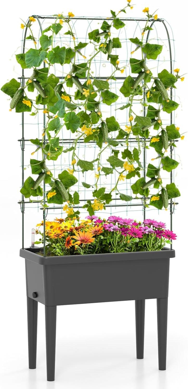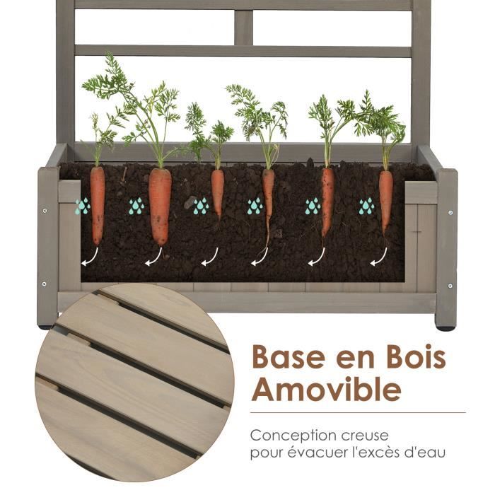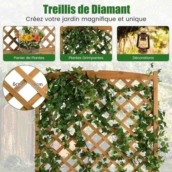 De plus, ce lit surélevé encourage les projets DIY, en faisant un choix excellent pour les passionnés de jardinage. Jardiniere Avec Treillis Jardinière En Treillis En Bois Jardinière D'intimité Pour Terrasse, Lit De Jardin Surélevé Avec Treillis Pour Plantes Grimpantes, Fleurs, Légumes Avec Trous De Drainage (couleur : Gris, Taille : 175 X Jardinière Treillis Métal Plantes Grimpantes Le jardin surélevé propose une combinaison astucieuse de bac à plantes et de treillis, vous permettant de personnaliser votre propre havre de jardinage. Avec une conception ingénieuse, nos jardinières combinent des boîtes de plantation et des treillis ensemble, vous permettant de faire pousser vos fruits et légumes préférés tout en affichant des plantes en panier et des fleurs grimpantes 【Cadre en métal robuste】Doté d'un cadre en métal revêtu de poudre, le jardin vertical avec treillis tient debout sans se fissurer. De plus, les coins renforcés augmentent la robustesse globale. Lit de Jardin Surélevé Résistance aux Intempéries pour Patio Jardin Balcon 63 x 31 x 112 cm, Noir · 5,05,0 sur 5 étoiles (1) · 92,99 €92,99€ · Livraison... 【Bac à plantes profond】Plus la profondeur du jardin surélevé est grande, plus de flore il peut accueillir. Construit avec un cadre en métal enduit de poudre, le jardin autoportant est résistant aux fissures et conçu pour résister à l'épreuve du temps. 【Applicable en intérieur et extérieur】Le conteneur de plantes haut avec treillis peut revitaliser les espaces intérieurs et extérieurs avec une esthétique captivante, parfait pour des zones comme le patio, le jardin, le balcon ou la terrasse. Costway 2PC 68in Boîte De Jardinière En Bois Avec Treillis Lit De Jardin Sur Lev Pour Plante Grimpante Caractéristiques : Treillis polyvalent pour aider les vignes à grimper et offrir des options pour exposer des ornements Grand bac à plantes offrant un espace généreux pour différentes plantes Construit avec un cadre en métal résistant aux fissures Coins renforcés et davantage de vis pour renforcer la solidité structurelle Non seulement un bac à plantes de jardin, mais aussi un écran d'intimité pour la cour Applicable aux environnements intérieurs et extérieurs, tels que balcon, jardin ou maison Assemblage requis Spécifications : Couleur : Noir Matériau : Métal Dimensions du produit : 63 x 31 x 112 cm (L x l x H) Taille intérieure du bac à plantes : 60 x 27 x 30 cm (L x l x H) Capacité de charge du bac à plantes : 50 kg Capacité de charge du treillis : 10 kg Poids net : 8,5 kg Contenu de l'emballage : 1 x Bac à plantes en métal avec treillis 1 x Guide de l'utilisateur 【Assemblage facile et DIY】Équipée d'un manuel clair présenté sous forme visuelle, la jardinière en treillis métallique assure un assemblage facile.