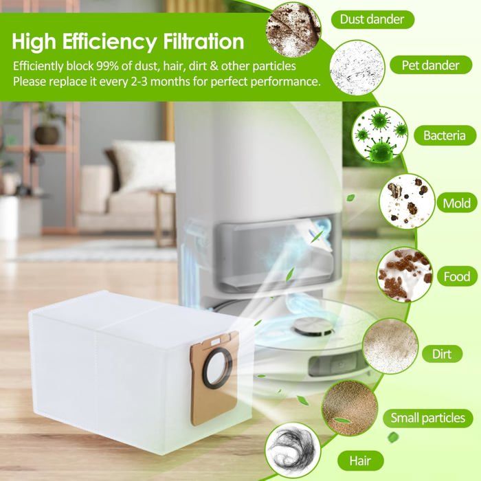Vistefly Lot de 3 Filtres HEPA pour Aspirateur sans fil V15, V15 Max Vistefly M203 Aspirateur Robot Laveur avec Station de Vidage... Sacs à Poussière Vistefly M203 Bac à Poussière Pour Robot Aspirateur SWRC90 H.Koenig – Le SAV : Ventes Sacs Poussière Vistefly M203 Détails de l'article : * Fabriqué en matériaux pour plus de durabilité. * Il est préférable de remplacer les pièces de rechange tous les 2 à 3 mois pour que la machine fonctionne à des performances optimales. SACS POUSSI RE de rechange pour aspirateur robot Vistefly M203 faciles... * Dans le cadre d'un entretien normal, il peut être facilement retiré et remplacé. [Ajustement exact pour aspirateur robot M203] Conçu spécifiquement pour le modèle M203, compatibilité et facilité d'utilisation pendant les routines d'entretien. [Emballage en vrac disponible] Offert en quantités de 4 ou 10 sacs à poussière, offrant une flexibilité selon vos besoins de nettoyage. Facile à remplacer : conçu pour un retrait et un remplacement faciles dans le cadre d'un entretien régulier, facilitant l'entretien facile de votre aspirateur.