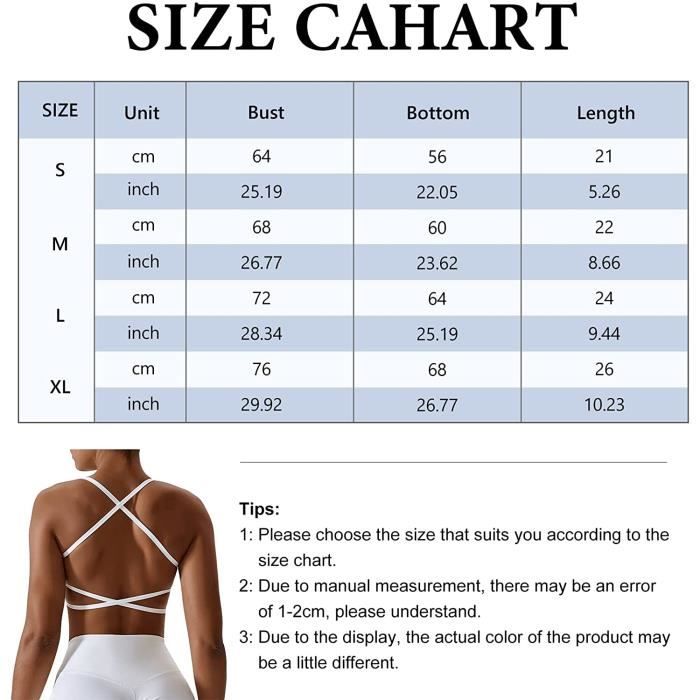 Soutiens-Gorge de Sport sans Couture avec Coussinets Amovibles pour... Les soutiens-gorge de sport pour femmes sont bien extensibles, conservent bien leur forme lorsqu'ils sont enlevés, sont confortables à porter et couvrent bien le corps. Guide des tailles : Veuillez vous référer à notre tableau des tailles et au poids recommandé pour choisir la taille qui vous convient le mieux. Soutien-gorge Sport Femme Brassière Sport Maintien Fort SKIN V2, Technique, Style,écoresponsable Sport Running Yoga Fitness Soutien-gorge de sport pour femmes : Nos soutiens-gorge de sport offrent un soutien adéquat et approprié aux femmes, avec une légère compression qui resserre le soutien-gorge pour maintenir toutes les zones en place et minimiser les rebonds. Grâce à leur coupe fonctionnelle, les soutiens-gorge de sport soutiennent, forment et enveloppent la poitrine fermement, évitant ainsi le ballotement. La brassière de sport protègera parfaitement votre poitrine et la maintiendra en place pendant l'effort * Le tissu est doux et confortable, vous permet de rester sec et confortable tout en faisant vos activités * Le forfait comprend: 1 * Soutien-gorge de sport pour femmes * Occasions: séances d'entraînement, yoga, course à pied, gymnase, forme physique et tout type d'entraînement ou d'utilisation quotidienne 1., Recommander le lavage à la main., 2., Veuillez prévoir une différence de 1 à 3 cm en raison de la mesure manuelle. Soutien-Gorge de Sport Femme à Bretelles Brassière de Yoga Coussinets