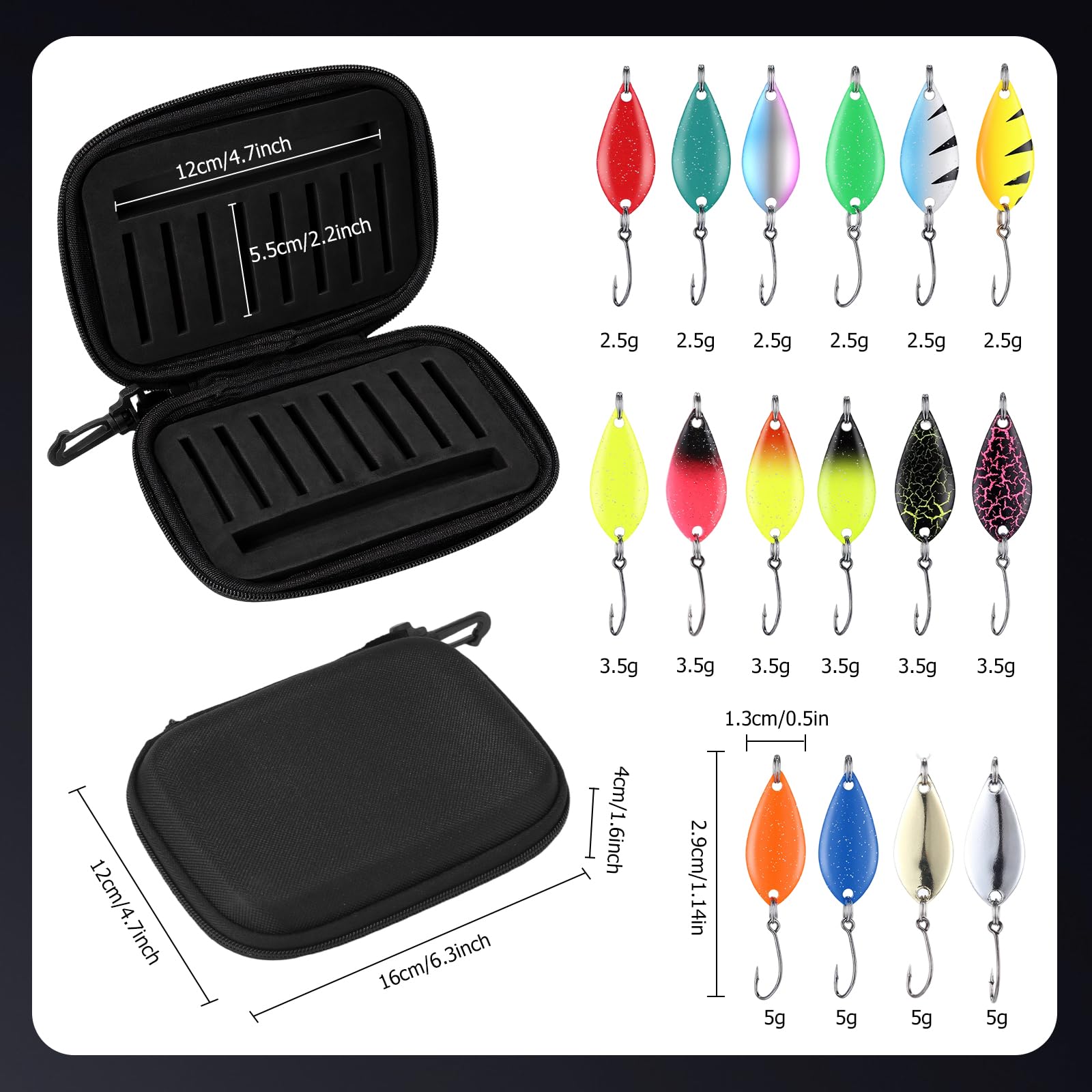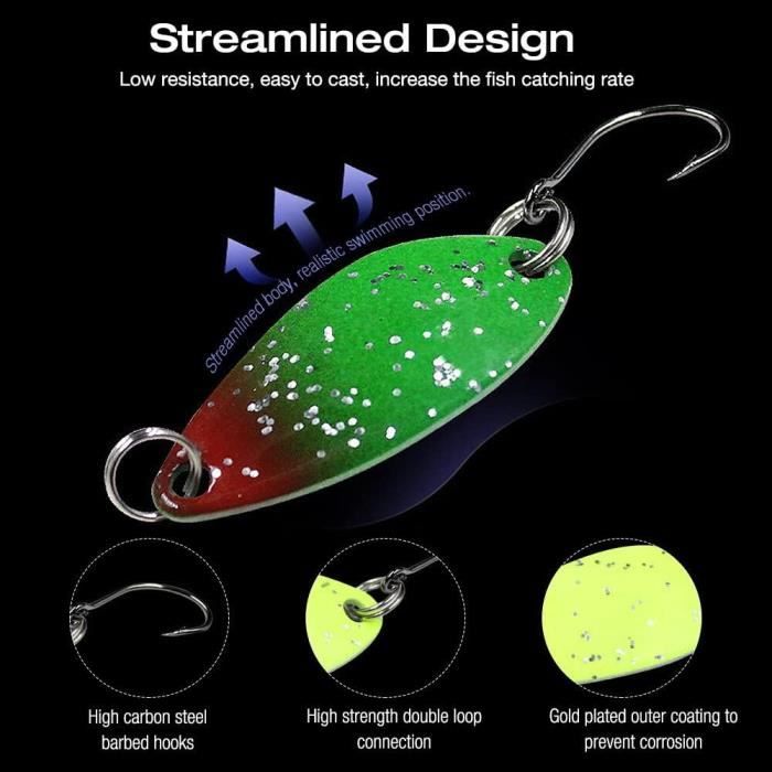 Conserver hors de portée des enfants. L'Art de la Pêche de la truite et du Saumon à la Mouche artificielle Caractéristiques multiples : avec un poids de 3 g/3,5 g/4,6 g/5 g/5,2 g et une variété de couleurs d'appâts, ce kit de cuillères à truite perche convient à tous les temps et toutes les situations et répond aux besoins de chaque pêcheur. Leurre Truite Riviere Leurres Cuillères Truite Lot De 46 Cuillères De Pêche Truite - Leurres Spinner 2g à 5g - Hameçon Simple - Boîte Incluse 46 Pièces Appâts Artificiels Métal Eau Douce Veuillez faire attention à la sécurité lors de la manipulation de ce produit. Caractéristiques : Nom : kit cuillère à truite. Lot de 16 cuillères de pêche, kit de leurres de pêche, kit de leurres... Large gamme d'utilisations : kit de cuillerée à appâts pour pêche en eau douce et en eau salée, convient pour la pêche ultra légère, ces appâts clignotants attrayants sont parfaits pour la pêche à la truite, au saumon, au mahi-mahi, au brochet, à la perche et plus encore. Matériaux de qualité supérieure : cuillère à truite fabriquée en métal, solide et pas facile à déformer, à la fois résistante à la corrosion et durable. Leurre De Peche Artificiel Pour Truite, Cuillere En Metal, Leurre Pour Pecher La Truite, Leurre Pour Pecher La Mouche, Triple Nage, 3,5 G, 5,5 G, 60 Mm, 3,5... Scénarios d'utilisation : convient aussi bien pour l'eau douce que l'eau salée. Matériau : métal de qualité supérieure. Peut produire un mouvement réaliste et une brillance dans l'eau pour attirer plus de truites, clignotant de pêche parfait, facile à tromper et à augmenter le taux de réussite de la pêche. Les hameçons pointus avec des crochets lourds permettent d'attraper et de relâcher facilement un poisson. Facile à ranger : le sac à truite est équipé de compartiments pour un rangement facile et une protection contre les blessures, et les cuillères à truite sont marquées à l'arrière afin que vous puissiez trouver rapidement la cuillère à truite souhaitée, les fermetures Velcro robustes permettent une fixation facile à la ceinture ou au sac de pêche.