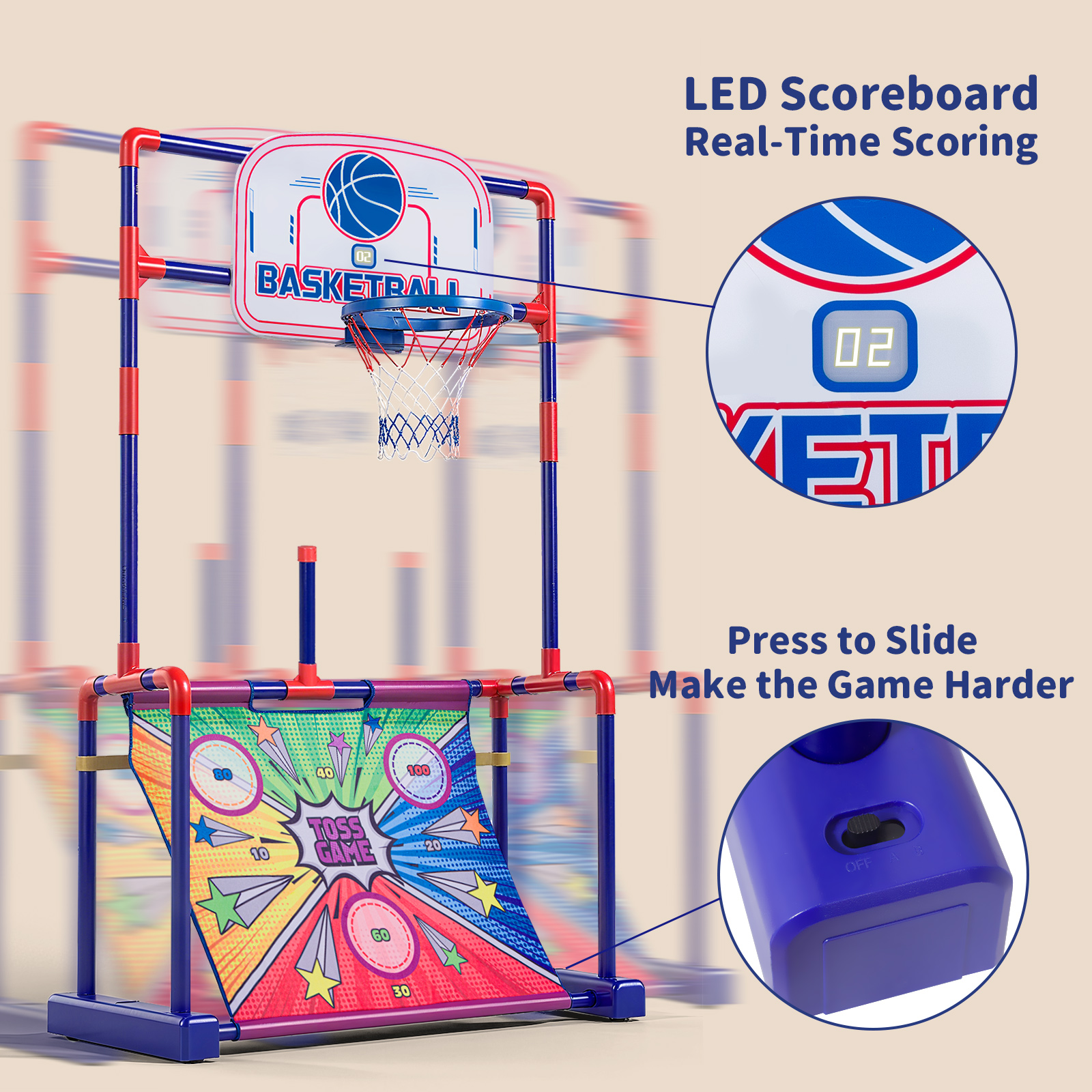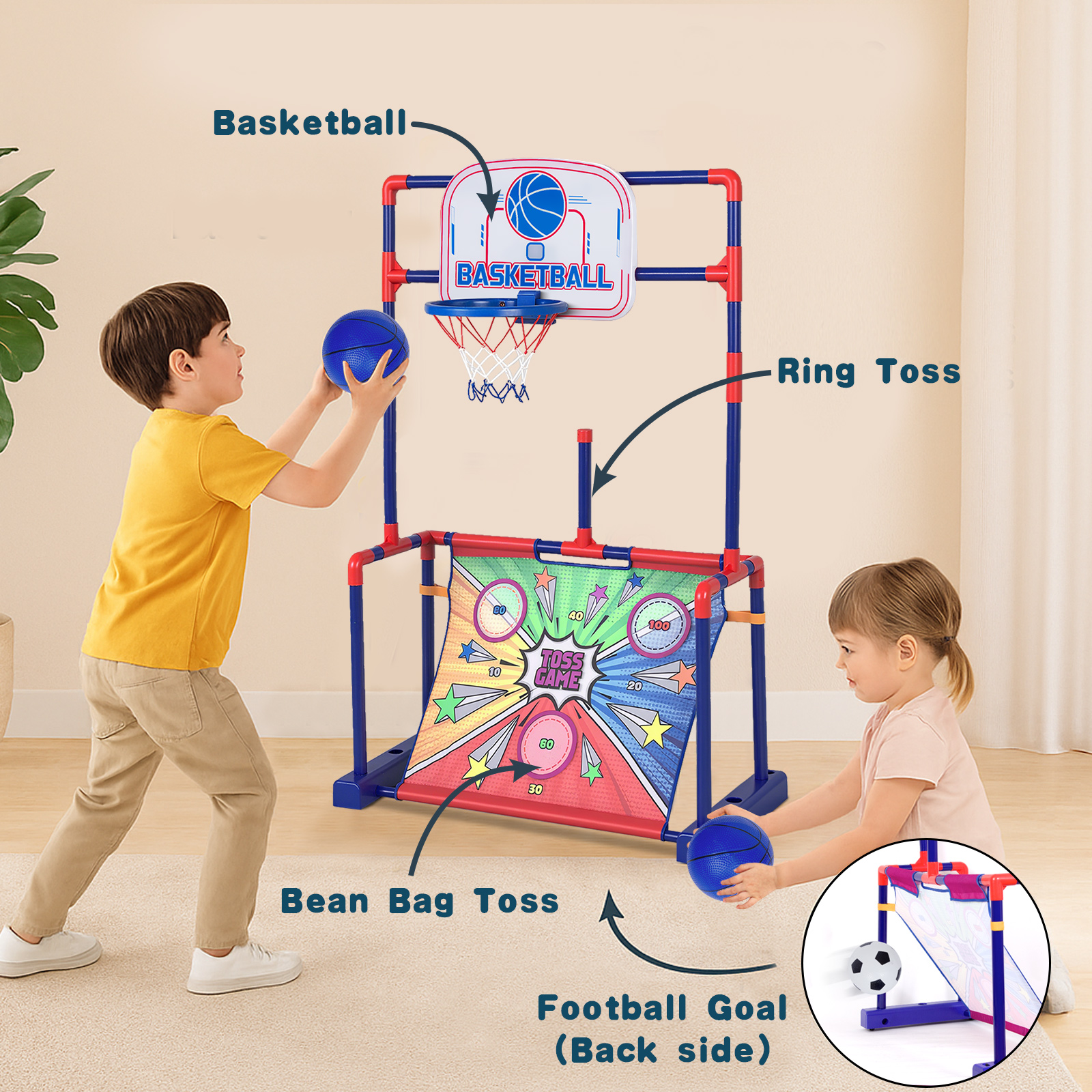 La base du stand peut être remplie de sable ou d'eau pour assurer une stabilité accrue et prévenir les risques de basculement. Panier De Basket Exterieur Enfant YOLEO Mini Panier Basket Enfant, Intérieur Panier De Basket Avec Ballon Et Pompe Pour, Porte Mur Football Lancer Anneaux Ce complexe sportif intégré trois en un invite les jeunes à engager des parties de basket-ball, de football et de lancer d'anneaux, tout en cultivant un sens du travail en équipe et de la compétition saine. MATÉRIAU DE QUALITÉ ET DURABLE : Cette aire de jeux avec toboggan est fabriquée en HPDE inodore pour garantir la sécurité et la durabilité. La surface lisse protège la peau des enfants, et la base large et la structure triangulaire assurent la stabilité du toboggan 3 EN 1 STATION DE JEUX MULTIFONCTION : Ce produit polyvalent combine un panier de basket, des jeux de lancer d'anneaux, et un terrain de football pour le plaisir multi-sport des enfants. Il est idéal pour encourager le jeu collectif et développer la compétitivité ainsi que l'esprit d'équipe chez les jeunes. Panier de basket Enfant Dunk sur pied réglable 1,60m à 2,20m - K900... Construit en plastique PP durable et de qualité Dispose d'une surface externe lisse pour minimiser les risques de blessures Les filets pour le basketball et le football peuvent être retirés et nettoyés facilement Installation et nettoyage du support sont conçus pour être simples et rapides Le set inclus : un ballon de basket, un de football, quatre anneaux de lancer et une pompe à air Spécifications : Couleur : Cyan + Gris Matériel : Plastique PP Dimension totale : 54cm x 49cm x 133cm-158cm (L x l x h) Hauteur du panier réglable : 88cm-128cm Taille du paquet : 56cm x 49,5cm x 15,5cm (L x l x h) Âge recommandé : 2-5 ans Poids net: 2,78 kg Poids brut: 3,41 kg Parties : 1 x stand de basket-ball 1 x Basket-ball 1 x Football 4 x Anneaux 1 x Gonfleur 1 x Manuel d’utilisation Avertissement De Sûreté / Le montage ajustable en hauteur du panier permet de s'adapter aux besoins changeants des enfants à mesure qu'ils grandissent, avec cinq options de réglage. REGLABLE FLEXIBLE DE LA HAUTEUR : Notre panier de basket est conçu pour grandir avec votre enfant, offrant cinq niveaux de hauteur différents. Panier de basket enfant | DECATHLON La base du stand peut être lestée avec de l'eau ou du sable, garantissant ainsi une grande stabilité et réduisant le risque de basculement. CONCEPTION SECURISEE ET STRUCTURE ROBUSTE : Fabriqué à partir de matériau PP de haute qualité, sûr, non toxique et sans odeur, ce produit garantit la sécurité et le bien-être des enfants.