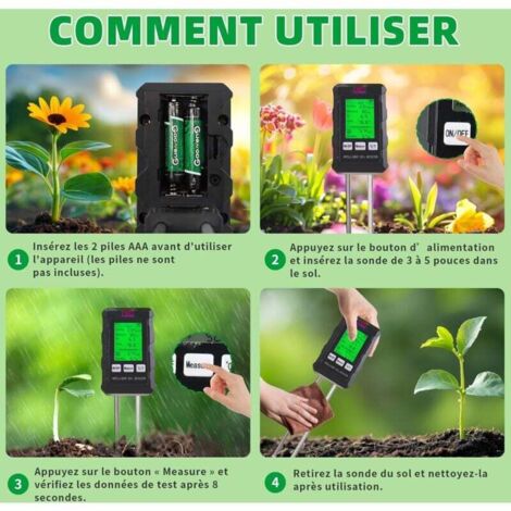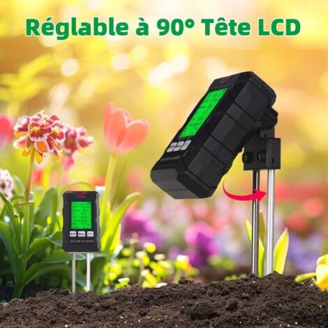 Pour Jardin Plantes D'intérieur Et Pelouse Tigrezy Testeur De Sol Numérique 5 En 1 - PH, Mètre, Lumière Du Soleil, Température, Mesure De L Appareil Mesure Sol Jardin écran LCD Rétroéclairé 4 dans 1 Mètre de pH numérique pour sol Mètre de pH et d′humidité en plein solei EC-mètre, humidité du sol, humidité de l'air, lumière, température pour jardinière d'intérieur, jardin extérieur, plantes en pot, ferme, pelouse, serre. Il... Écran LCD Clair avec RÉTROÉCLAIRAGE : Lisez vos résultats sans effort, jour et nuit ! Compartiment à piles inclus pour 3 piles AAA (non fournies) Utilisation Simplissime, Résultats Rapides : Insérez la sonde à 10 cm de profondeur, attendez 10 secondes et lisez les mesures précises ! DEESOSPRO Testeur de Sol Numérique 6-en-1 | pH, Humidité, Lumière, Température & Fertilité | Écran LCD Rétroéclairé | Mesure Instantanée pour Jardin, Pelouse & Plantes Aucun calibrage complexe – idéal pour débutants et experts. L’écran flexible s’ajuste à votre angle de vue, que ce soit en jardinière, pot de fleurs ou sur la pelouse. Universel : L’Assistant Parfait pour TOUTES les Plantes ! 6-en-1 Multifonction Nouveau Design : Mesurez INSTANTANÉMENT & PRÉCISÉMENT le pH, l'humidité du sol, l'intensité lumineuse, la température et la fertilité ! Obtenez toutes les données vitales pour des plantes saines d'un seul coup d'œil - fini les conjectures pour l'arrosage, la fertilisation ou le choix de l'emplacement. Écran LCD Clair avec RÉTROÉCLAIRAGE