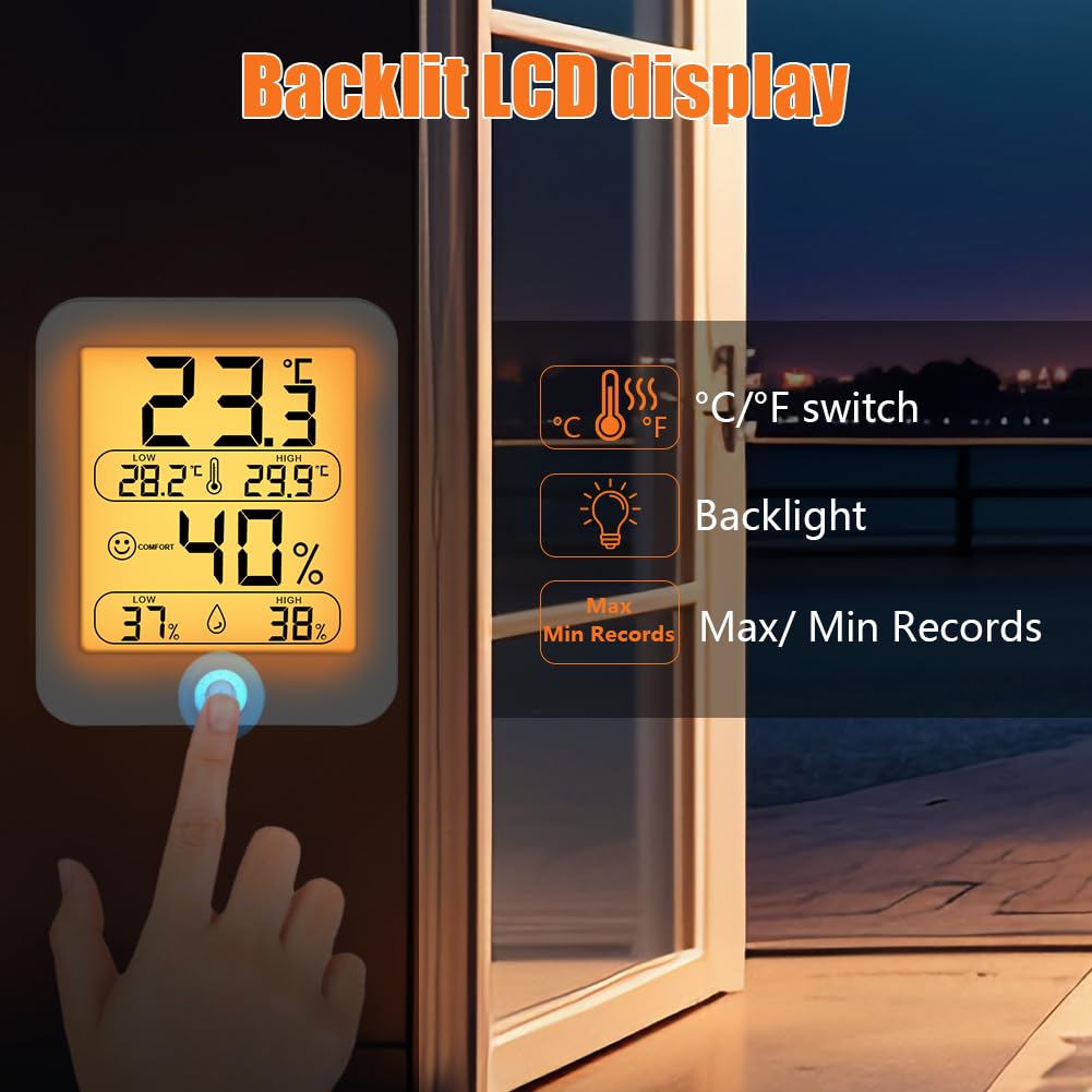 Utilisations multiples : surveillez la température de votre chambre, chambre de bébé, salle d'instruments de musique, etc. Station météo sans Fil, hygromètre pour thermomètre extérieur intérieur Utilisations multiples : parfait pour surveiller la température et l'humidité dans divers environnements tels que les chambres, les chambres de bébé, le rangement d'instruments de musique, et plus encore, ce qui en fait un outil pour chaque maison. Temperature Interieur Thermomètre Numérique D'usine Hygromètre Jauge De Température Thermomètre Avec Rétroéclairage Noir Affichage rétroéclairé, s'éteint automatiquement après 8 secondes. Dimensions : 59 x 22 x 80 mm. Thermomètre numérique,white--Réfrigérateur numérique LCD, thermomètre... Rappel des tailles : veuillez vous référer à votre propre tableau des tailles pour un meilleur ajustement, car ce thermomètre est conçu pour être compact à 59 x 22 x 80 mm. Résolution d'humidité : 1 % pour HR. Ce thermomètre et hygromètre numérique d'intérieur est conçu pour fournir des mesures précises de la température et de l'humidité. Grâce à son capteur haute sensibilité, il met à jour les données toutes les 5 secondes, offrant ainsi une réactivité optimale Plage de mesure : Température : -20 °C ~ 70 °C., Humidité : 10 % ~ 99 %. Alimentation : 2 piles AAA 1,5 V (non fournies). (entre 30 % et 70 % pour la plage HR). Affichage rétroéclairé et indicateur de confort : grand écran rétroéclairé pour des lectures claires, avec un indicateur de confort avec symbole du visage. Alimentation pratique : fonctionne avec 2 piles AAA 5 V (non incluses), offrant une source d'alimentation fiable pour une surveillance continue sans les tracas des cordons ou des prises.