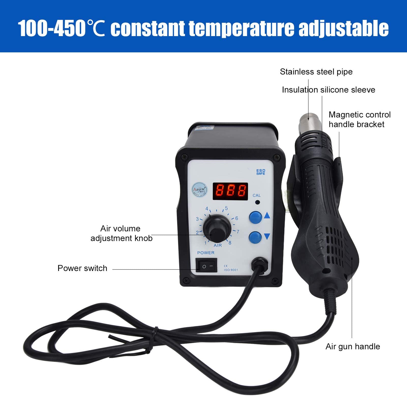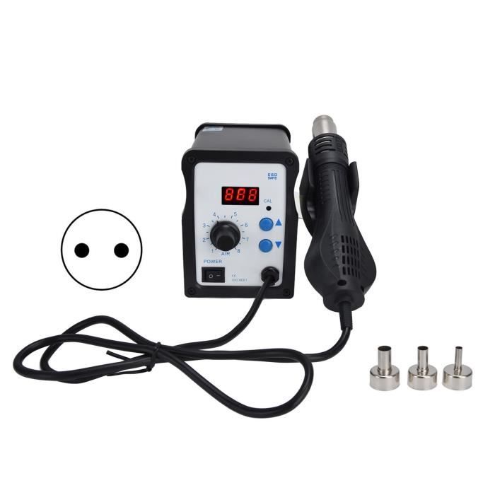 Avec une plage de température réglable de 100 °C à 480 °C, elle se réchauffe rapidement en seulement 3 à 5 secondes, ce qui la rend idéale pour des applications... Contrôle : température par bouton, flux d'air par bouton rotatif Remarque avant l'achat. L'appareil fumera lors de la première mise sous tension, c'est normal. Veuillez vérifier le numéro de modèle et les spécifications techniques avant l'achat. Niveaux de flux d'air : 8., Charge maximale : Volume d'air : 120 l/min (26,4 gal/min). Contrôle intelligent du capteur : le support magnétique active automatiquement le mode veille lorsque la poignée est posée et chauffe immédiatement dès que la poignée est prise - Idéal pour un travail sans interruption Station de Reprise de Soudure Numérique à LED 700W, Station de Reprise D'air Chaud et de Fer à Souder 2 en 1 avec Conversion D'air Froid/chaud pour le Utilisez uniquement les buses fournies – pas de petites buses sur les modèles sans balais. Taille du produit: 15,3 × 9,3 × 13,1 cm / 6,02 × 3,66 × 5,16 in Flux Air 8 Niveaux Buses Incluses Station De Soudage 700 W, Station De Soudage à Air Chaud Avec Affichage Numérique LED ContrôLe De Température à 10 Niveaux 100~480 ° C Ensemble De Fer à Souder Avec 8 Pointes Soudeuse Air Chaud 100-450°C Mode de fonctionnement : filaire (prise UE) , Support : autoportant. Contenu de la livraison : 1 station de soudage numérique à air chaud. Noyau de chauffage : nickel-chrome-métal. EN STOCK : 8898D, Station à air chaud, Fer à souder à air chaud, Station de soudage et de reprise à air chaud, Affichage numérique LED, Station de reprise à air chaud 700 W avec 4 buses, Station de soudage et de, SYSW000072 pas cher. Livraison rapide partout en France Un équipement de protection individuelle tel que des lunettes et des vêtements résistants à la chaleur est recommandé (non inclus). 1 manuel d'utilisation (en chinois et anglais). Facile à utiliser : l'affichage numérique LED, les commandes claires et le contrôle du flux d'air à 8 niveaux offrent un contrôle convivial et précis Connectez correctement l'appareil avant la mise en service (le capteur de poignée réagit à la position). 3 × buses d'air (diamètre : 5 mm, 8 mm, 10 mm) Haute sécurité : poignée isolée, protection contre la surchauffe, transformateur intégré et pieds antidérapants assurent un travail sûr même en cas d'utilisation intensive