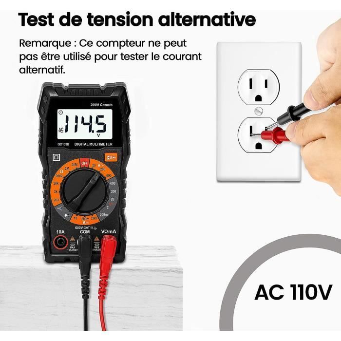 Dimensions totales (L x l x h) : 132 x 62,2 x 34,4 mm. Avec notre voltmètre, allumez l'éclairage de l'écran en appuyant sur un bouton. Vous pouvez voir clairement les valeurs de l'écran même dans un environnement sombre et sont donc faciles à lire. Précision de résistance : ± (1,2 % + 5). Notre multimètre numérique dispose d'un support réglable, d'un design innovant de support vertical incliné qui peut être placé sur la table à un angle. DM91 et CSX - multimètre numérique rétro-éclairé ca-cc, 1999 comptes... Assurez la sécurité - Le testeur de tension est un multitesteur avancé qui garantit un fonctionnement sûr à 600 V et est conçu pour une utilisation sûre et précise par les électriciens sur le lieu de travail ou pour les personnes qui ont besoin de plus de fonctions que le compteur standard. Précision de tension continue : ±(1,0 % +5)., Affichage maximal : 1999., Fonctions de mesure : résistance, tension continue, courant alternatif. Écran LCD rétroéclairé. Multimètre Auto-alimentation Multimètre Numérique, Multimètre Digital, Voltmètre Multifonctions 4000 Comptes, Testeur Testeur Tension Courant Continu Alternatif Multimètre Numérique, Multimètre Digital, Voltmètre Multifonctions 2000... Conception réfléchie : nos multimètres numériques prennent en charge le stockage de données, les grands écrans LCD rétroéclairés, l'arrêt automatique et le support pour faciliter le processus de mesure. 1 manuel d'utilisation (français non garanti)., 1 câble de test. Contenu : 1 multimètre numérique., 1 boîte de couleur. Écran LCD rétroéclairé, la lampe de poche facilite l'utilisation dans les zones faiblement éclairées. DM91 et CSX - multimètre numérique rétro-éclairé ca-cc, 1999 comptes Multimètre numérique multifonctionnel : le voltmètre mesure jusqu'à 600 V CA, 600 V CC, courant AC/DC 10 A et résistance de 20 MΩ, mesure la précision de la température, la capacité, la fréquence, la durée de fonctionnement et le test des diodes et de la continuité. Plage de tension CA : 600 V., Précision CC : ± (1,5 % + 5). Plage de tension continue : 600 V. Si le testeur de tension n'est pas utilisé dans les quinze minutes suivant l'allumage, il s'éteint automatiquement, ce qui permet d'économiser de l'énergie et des soucis., Entièrement fonctionnel.