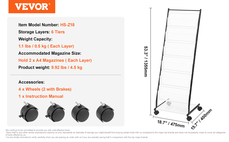 1 x Manuel d'utilisation Ses roulettes pivotantes à 360° facilitent son déplacement. Que ce soit dans les bureaux, les salles de réunion ou les bibliothèques, il garde les matériaux clairement visibles, améliorant ainsi l'efficacité du travail et l'efficacité de l'affichage. Présentoir à brochures 6 niveaux, porte-brochures sur pied avec roulettes, porte-revue en métal pour journaux, présentoir à magazines mobile pour... Poids net : 9,33 lb / 4,23 kg Espace de stockage accru La conception de la couche de stockage inférieure offre un espace supplémentaire pour le stockage des fichiers, améliore l'utilisation de l'espace et maintient les bureaux, les bibliothèques ou les sites d'exposition propres et organisés. Présentoir à brochures : pliable et stable Dimensions du produit : 325 x 400 x 1 530 mm Son rangement et sa présentation efficaces vous permettent d'organiser vos dossiers sans occuper trop d'espace. Il répond aux besoins de différents scénarios d'utilisation et dispose de suffisamment d'espace pour vous aider à gérer et à afficher efficacement divers matériaux. 4 x poteaux verticaux latéraux Même avec plusieurs dossiers empilés, le présentoir à documents reste stable et ne risque ni de tomber ni de basculer. Son traitement antirouille et anticorrosion assurent sa durabilité et préviennent la décoloration. Couches de stockage : 6 niveaux Stockage de grande capacité : Chaque compartiment peut facilement contenir 1 magazine A4, et la couche de stockage inférieure peut stocker des journaux, des brochures, etc. Assemblage simple Aucun outil compliqué n'est requis. présentoir à brochures mobile Que vous l'ajustiez quotidiennement ou le déplaciez, ce porte-revues sur pied vous offrira une expérience d'utilisation optimale Dimensions internes du cadre : 290 x 30 x 180 mm Spécification Numéro du modèle de l'article : HS-Z19 6 x étagères en filet Gain de place Ce présentoir à magazines compact et peu encombrant optimise l'utilisation de l'espace de bureau ou d'exposition. 1 x clé à fourche M10–M12 Caractéristiques principales Organisation efficace Ce présentoir à brochures à 6 compartiments vous aide à organiser et à afficher facilement divers supports promotionnels, documents, magazines, etc. Présentoir à brochures Ce présentoir à brochures à 6 compartiments est idéal pour organiser efficacement vos documents. Présentoir Magazines Bureau Présentoir à Brochures, Porte-revues En Fer à 4 Couches, Porte étagère Brochures A4 Capacité 2kg La structure en couches permet d'afficher divers matériaux de manière ordonnée, ce qui facilite l'accès Convient pour : documents de 8,5 x 11 pouces / 215,9 x 279,4 mm Capacité de poids : 2 kg / 4 lb par niveau, 8 kg / 17,64 lb pour le niveau inférieur