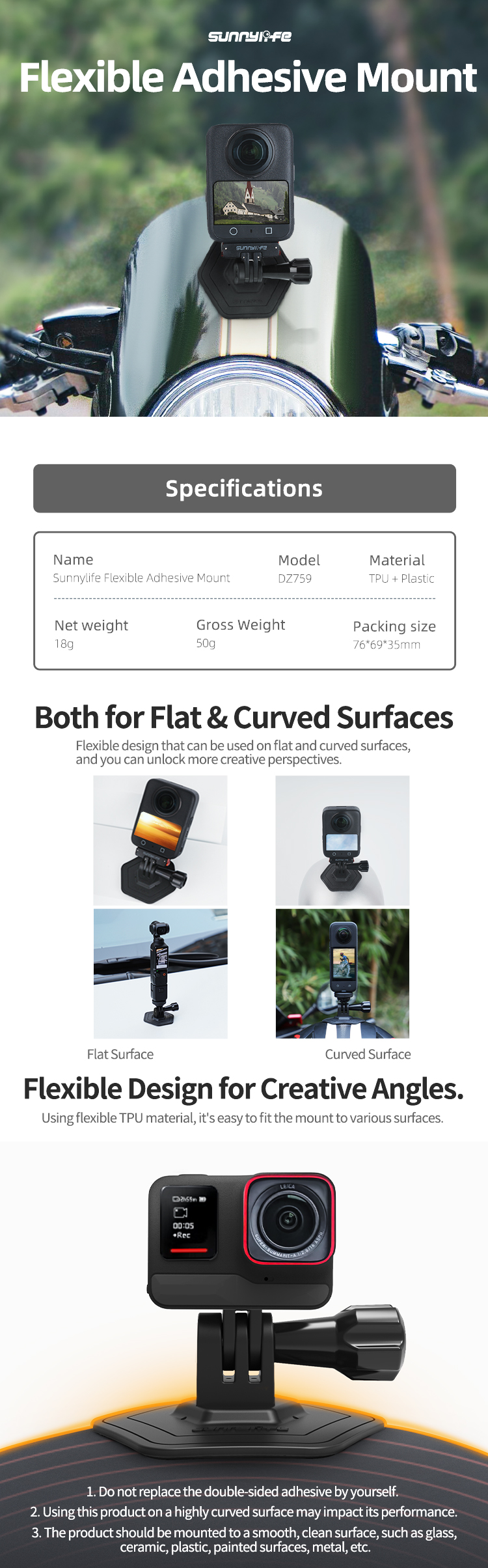Insta 360 Flexible Adhesive Mount, Premium Helmet Mount Accessories Adapt To Various Models Compatible With x3 Action 4 Gopro(Black Action Camera Lisez attentivement le manuel avant utilisation. Liste d'emballage : 2 supports adhésifs flexibles (avec autocollants 3M), 1 bâton en fibre de carbone, 1 adaptateur 1/4 vers 2 branches, 1 adaptateur, 2 vis à molette, 1 corde de sécurité, 1 lingette de nettoyage, 1 manuel d'utilisation. Conçu pour les sports extrêmes, les aventures outdoor ou le vlogging quotidien. Support Adhésif Flexible Caméra Action Maectech Support Adhésif Flexible Compatible Avec Pour Camera Insta 360 Montage universel : Livré avec un adaptateur 1/4 vers 2 branches pour une utilisation avec différents accessoires d'appareils photo action. Bâton en fibre de carbone de 4,7/12 cm pour encore plus de possibilités. S'adapte facilement au support sur diverses surfaces, même incurvées — réservoirs d'essence, pare-brise, capots de voiture. Un bâton en fibre de carbone : Améliorez vos prises de vue avec des perspectives uniques.