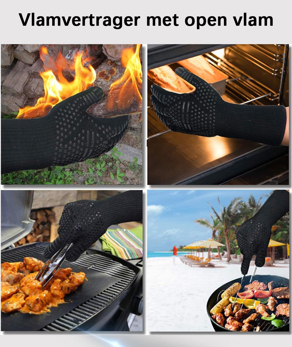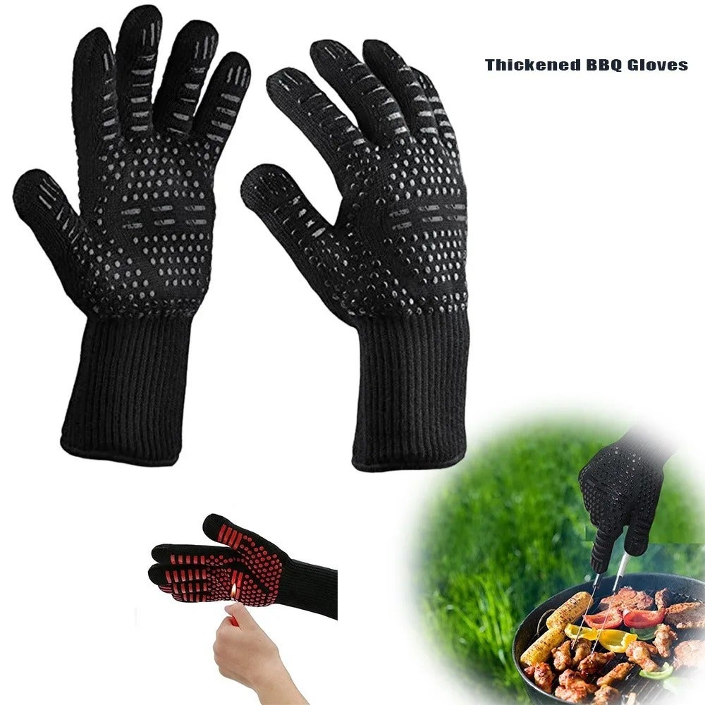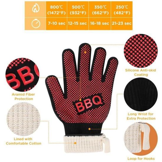 Leur longueur étendue protège efficacement vos poignets tandis que le design ergonomique épouse parfaitement la forme naturelle des mains. Caractéristiques : nos gants de barbecue améliorés 2025 sont faciles à accrocher via les anneaux de suspension, gants de four résistants à la chaleur extrême, tricot allongé, empêche efficacement les brûlures, plus sûrs, offrent la plus haute protection pour vos mains, poignets et avant-bras, antidérapants, résistants à l'usure... Style Pratique: Leur couleur noire classique dissimule naturellement les taches liées aux grillades. Polyvalents, ces gants s'adaptent parfaitement aux grillades extérieures, cuissons au four, fumoirs ou toute activité culinaire nécessitant une protection thermique fiable. Gants Cuisine Haute Température 500°C Gants Barbecue Résistants Chaleur Extrême Protection Silicone Gants Silicone Protection 500°C Leur structure tissée respirante évite la transpiration excessive tout en maintenant une protection thermique optimale contre les flammes directes. Cette paire robuste offre une protection maximale contre la chaleur intense jusqu'à 500°C, vous permettant de manipuler sereinement grilles brûlantes, charbons ardents ou plats sortant du four. Matériau Supérieur: Fabriqués avec une combinaison robuste aramide-silicone, ces gants résistent aux températures extrêmes jusqu'à 500°C. Le motif flamme texturé ajoute non seulement un élément esthétique mais améliore également la fonctionnalité grâce aux propriétés antidérapantes intégrées. Polyvalence Remarquable: Parfaits tant au jardin que dans votre cuisine, ces gants excellent lors des grillades estivales, cuissons au four, manipulation des plats chauds ou préparation des repas nécessitant une protection thermique. La longueur étendue protège efficacement vos poignets tandis que le tissu respirant évite toute transpiration excessive durant les longues sessions cuisine. Conception Avancée: Ces gants barbecue présentent un motif antidérapant unique qui assure une prise ferme même avec des ustensiles huileux. Résistance extrême à la chaleur : ces gants de barbecue résistent à des températures allant jusqu'à 500 °C, manipulation sûre des articles chauds pendant la cuisson et la cuisson sans brûlures Leur conception intelligente combine aramide résistant aux flammes et silicone antidérapant, créant une barrière efficace contre les brûlures tout en assurant une prise ferme sur vos ustensiles. Un choix attentionné qui combine sécurité et fonctionnalité, démontrant votre considération envers les passions culinaires du destinataire. Gants Pour Barbecue Résistant À La Chaleur