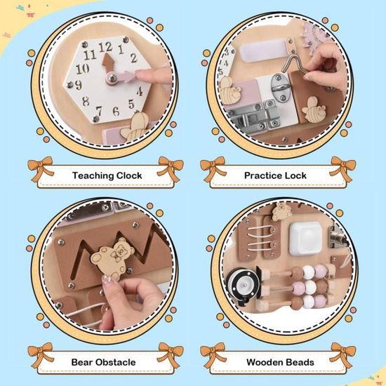 Planche Activités Montessori Test Du Tableau D'activités Montessori DeMoca En Bois : Développement Moteur Busy Board Enfants 1-3 Ans Motricité Fine Montessori Planches d'activité en bois – Loquets en bois | Planche d'activités en bois, jouet de Yapasopu Montessori Planche d'Activités en Bois Table d'Activités Éducative pour Apprendre la Motricité Jouets Éducatifs Busy Board (Rose) : : Jeux et JouetsDemandez le retour de ce produit dans les 14 jours suivant la réception, pour quelque raison que ce soit, afin d’obtenir un remboursement complet (prix de l’article et frais de livraison) dans le cadre de votre droit de... Trouvez différentes activités dans 1 tableau sensoriel : horloge d'enseignement du chronométrage, perles en bois, serrures d'entraînement, loquets, clés d'apparence réelle, boucles, vêtements, cloches, rouets. 【Cognition sensorielle】Lorsque votre enfant reste à la maison, le meilleur moyen de divertir et d'éduquer est le tableau sensoriel multifonctionnel. 【Jouets éducatifs】Le meilleur jeu de puzzle pour les enfants est le tableau occupé, qui permet à vos enfants de s'y consacrer. 【Tableau de jouets multifonctionnel】Nos jouets éducatifs sont spécialement conçus pour les enfants âgés de 1 à 3 ans. Aide à améliorer la coordination œil-main, la pensée logique, l'expérience sensorielle, la motricité fine et la résolution de problèmes. 【Cadeaux parfaits】 Si vous cherchez le cadeau parfait pour les tout-petits qui aiment apprendre et explorer, alors c'est votre meilleur choix ! C'est une aide pédagogique préscolaire et un jouet pour les activités parent-enfant. Il s'adresse principalement aux jeunes enfants âgés de 9 mois à 6 ans. Composé d'une variété de jouets en bois et de matériel pédagogique, cette planche n'est pas seulement un jeu ludique mais également un atout majeur pour le développement de l'enfant