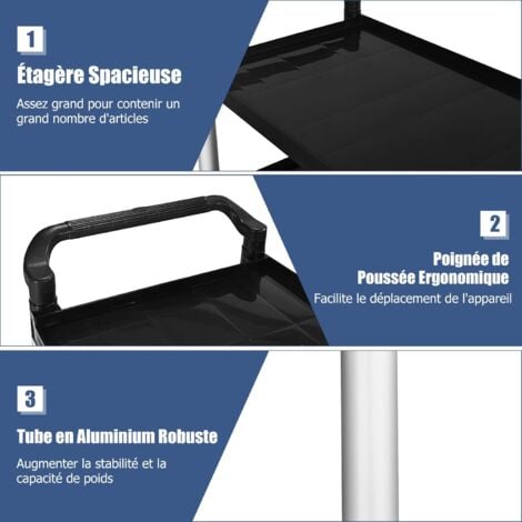 COSTWAY Servantes d’Atelier Mobiles Chariot à Outils 2 Etages avec Poignée Charge 100 kg en 【Capacité robuste】Relevez les tâches lourdes avec ce chariot utilitaire à 3 niveaux, doté d'une structure en aluminium solide qui supporte sans effort une charge maximale de 75kg par étage et 225kg au total. Chariot Mobile Polyvalent COSTWAY Chariot à Outils 2 Étagères Charge 50 Kg Avec Poignée, Chariot Chariot 3 étagères Aluminium Caractéristiques : Construction en aluminium robuste, légère et antirouille pour une haute stabilité 3 étagères en PP de haute qualité résistent aux rayures, aux taches Rebords surélevés de 1 pour la sécurité des objets en déplacement 2 roues verrouillables assurent la stabilité et la sécurité du chariot Poignées doubles pratiques pour un contrôle de direction précis Conception spacieuse parfaite pour la cuisine, l'entrepôt, le bureau, le garage, le pique-nique Facile à nettoyer et à entretenir pour une utilisation durable Facile à assembler avec des instructions claires Spécifications : Couleur : Noir, Argent Matériau : PP, Aluminium Dimension globale : 80 x 41 x 97 cm (L x l x H) Dimension de chaque niveau : 61 x 40 x 3 cm (L x l x H) Diamètre de chaque roue : 10 cm Capacité de poids de chaque niveau :75 kg Capacité de poids totale : 225 kg Poids net : 9 kg Contenu de l'emballage : 1 x Chariot utilitaire 1 x Instruction Espace de rangement suffisant]Conçu avec 3 étagères spacieuses, ce chariot à outils peut accueillir une variété de tournevis, pinces, perceuses, etc Des offres de produits similaires pourraient vous intéresser CostwayChariot Roulant à 3 Niveaux Chariot de Rangement Pliable 3 Gobelets Suspendus 6 Crochets Roues Métalliques Verrouillables Universelles Blanc 50,99 € Livraison gratuite Voir l'offre Comparer les prix CostwayChariot Roulant à 3 Niveaux Chariot de Rangement Pliable 3 Gobelets Suspendus 6 Crochets Roues... Chaque étagère est faite de PP de haute qualité pour éviter les rayures et les taches lors d'une utilisation à long terme. Idéal pour le travail en entrepôt, les charges lourdes de cuisine, etc. Et le rebord surélevé offre une protection attentive. Simplifiez vos tâches avec la performance élégante mais puissante de ce chariot utilitaire polyvalent, qui est un investissement judicieux pour des environnements de travail efficaces et organisés. 【Mobilité sécurisée】Le chariot utilitaire est équipé de 4 roulettes universelles, dont 2 verrouillables, offrant un transport stable et sécurisé pour vos outils et fournitures précieux. Chaque niveau, fabriqué à partir de PP premium, offre un espace ample et résistant aux taches, bordé par un rebord protecteur.
