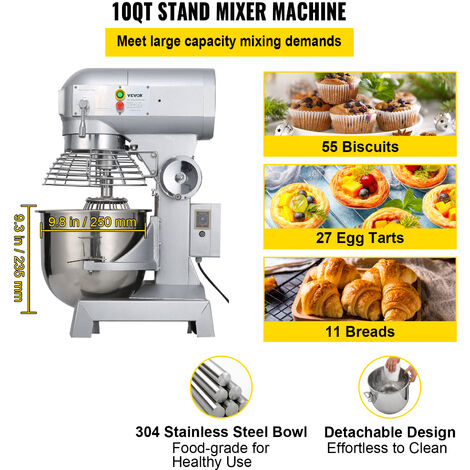QUALITÉ SUPÉRIEURE & GRANDE CAPACITÉ - Ce mélangeur industriel est fabriqué en acier inoxydable et aux normes d'hygiène. 2,2 livres / 1 kg pâte à la fois. 3 Vitesses RéglablesLe 450 W moteur haute performance assure un fonctionnement stable, offrant trois vitesses de mélange réglables (110 tr/min / 178 tr/min / 390 tr/min) pour vous aider à mélanger efficacement vos aliments. Capacité de Pétrissage : 2,2 lbs / 1 kgDimensions du Produit : 14,4 x 17,7 x 23,9 pouces / 36,6 x 45 x 60,6 cmPoids du Produit : 105,8 lbs / 48 kgContenu du Coffret1 x Mélangeur de Pâte Commercial1 x Crochet à Pâte1 x Batteur Plat1 x Fouet Métallique 3 Agitateurs InclusCe batteur sur socle a trois accessoires remplaçables, dont un crochet pétrisseur en spirale, un batteur plat et un fouet métallique. Marque. Happybuy · Couleur. Commercial Food Mixer · Dimensions du produit. 54,6P x 43,9l x 88,1H centimètres · Caractéristique spéciale. Bol amovible · Capacité. 30... CONCEPTION PROTECTRICE - Un protège-bol en fil d'acier inoxydable est conçu pour empêcher les gros articles de tomber dans le bol pendant le fonctionnement ; La hauteur du bol peut être facilement ajustée par une roue rotative; Les boutons START et STOP fonctionnent indépendamment, garantissant la sécurité. SpécificationPuissance : 450 WVolume du Bol : 10 QT / 11 LVitesse de Mélange : 110 tr/min, 178 tr/min, 390 tr/minMax. Les pièces de mélange en acier inoxydable de qualité alimentaire sont robustes et durables à utiliser. Batteur Mélangeur Professionnel 10 Litres Batteur Mélangeur Planétaire Batteur Pétrin Professionnel De 10L 550W 3 Capacité Max 1kg Pâte Le 450 W moteur haute performance assure un fonctionnement stable, offrant trois vitesses de mélange réglables (110 tr/min / 178 tr/min / 390 tr/min) pour vous... Le puissant moteur de 450 W avec transmission à engrenages pour la durabilité et la fiabilité répond à différentes exigences de mélange. ACCESSOIRES REMPLAÇABLES - Trois accessoires remplaçables sont disponibles. Le bol d'une capacité de 10 L est assez grand pour mélanger 1 kg de pâte en une seule fois. APPLICATION LARGE - Ce mélangeur multifonctionnel commercial est parfait pour mélanger la pâte, la pâtisserie, la purée de légumes, la mayonnaise, etc. Pétrin Professionnel : Boulangerie et Pâtisserie au meilleur prix TROIS VITESSES RÉGLABLES - Le batteur sur socle offre trois vitesses de contrôle différentes (110 tr / min / 178 tr / min / 390 tr / min). Il empêchera également les ingrédients d'éclabousser tout en vous montrant la situation intérieure. Une roue tournante est équipée pour régler la hauteur du bol, qui peut parfaitement s'adapter aux différentes exigences de mélange. Ils sont parfaitement conçus pour vous permettre de mélanger tous les types d'aliments.