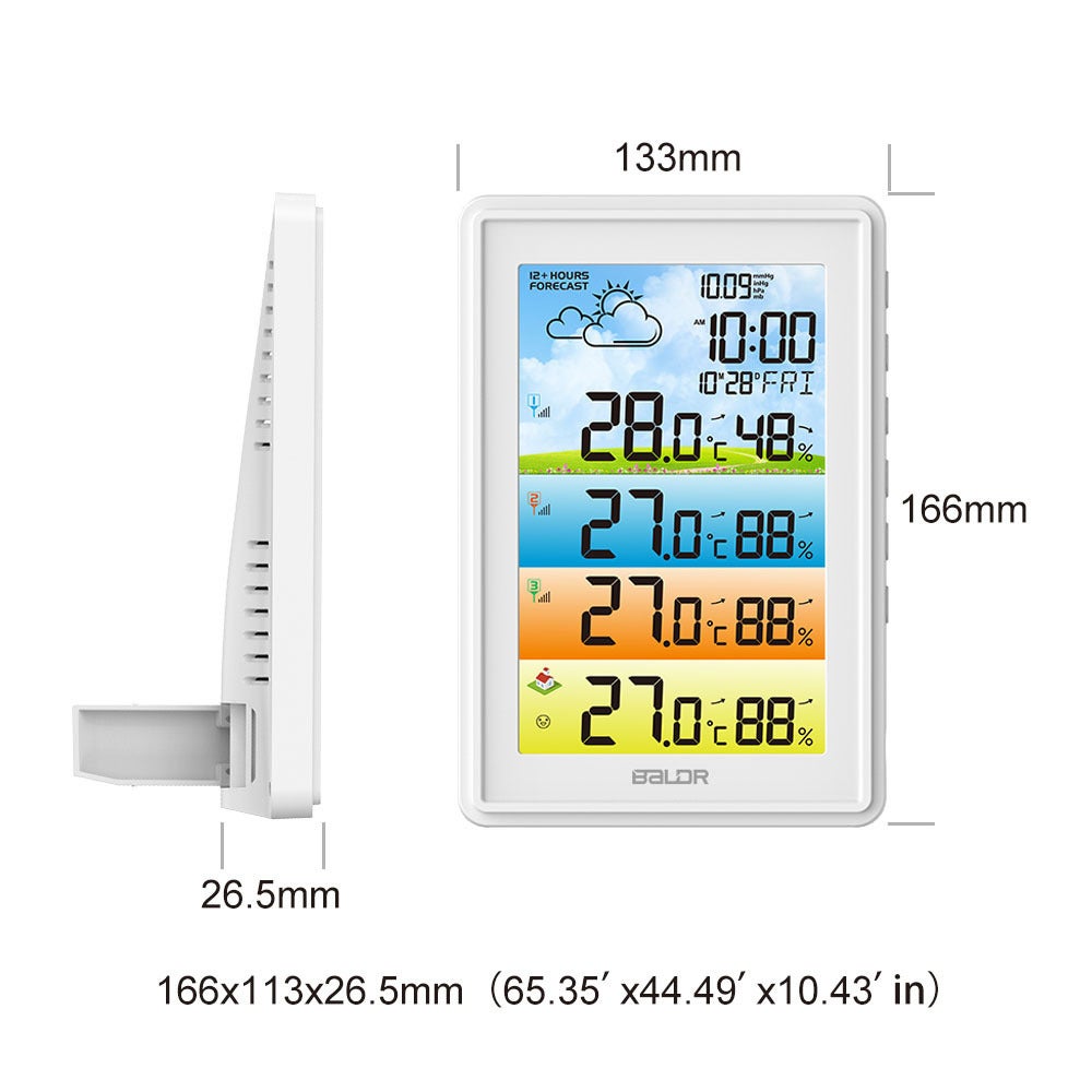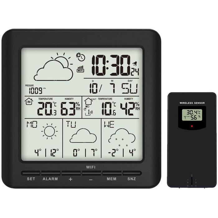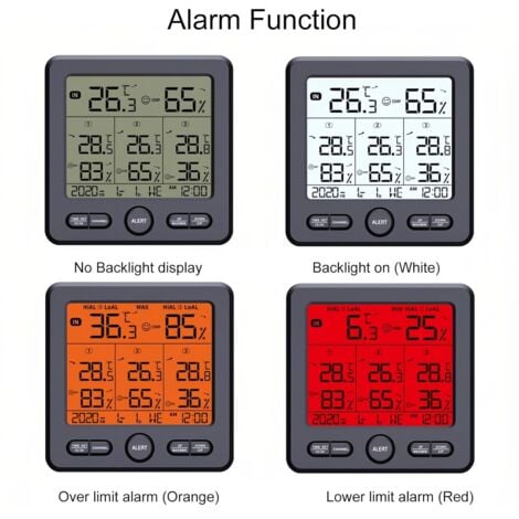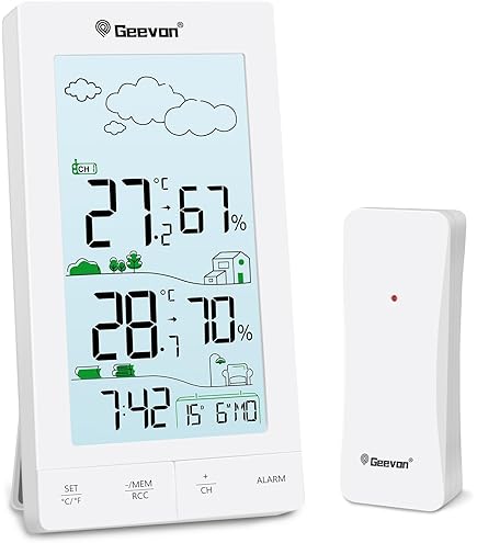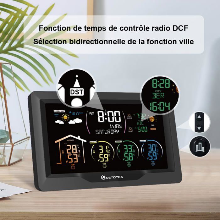 L'appareil conserve automatiquement les max., et min. de température et d'humidité sur 24h, appuyez brièvement sur MEM pour les consulter. Écran LCD rétroéclairé de 4,4 pouces Surveillance climatique précise: équipée de capteurs de haute précision, cet appareil fournit des relevés de température fiables avec une précision de ±1°C et des relevés d'humidité avec une précision de ±5%HR. Ce station météo sans fil est parfait pour les environnements nécessitant un contrôle climatique strict, tels que les entrepôts, les serres, les salles de stockage et les installations de stockage à froid, vous permettant de réagir rapidement aux changements environnementaux Grand écran clair avec rétroéclairage ajustable: doté d'un écran LCD de 4,4 pouces pour une lisibilité facile. Ce dispositif vous aide à déterminer rapidement si votre environnement est trop humide (plus de 70%), confortable (entre 40% et 70%) ou trop sec (moins de 40%), pour un meilleur bien-être. Grâce à son grand écran LCD, les informations sont faciles à lire. Station météo sans fil avec capteur extérieur, affichage numérique... Indicateurs informatifs pour une sensibilisation accrue: profitez des indicateurs MAX/MIN qui enregistrent les valeurs de température et d'humidité les plus élevées et les plus basses sur une période de 24 heures. L'appareil indique l'évolution de la température et de l'humidité sur la dernière heure à l'aide de flèches (hausse, baisse ou stable). 3 capteurs inclus, adaptés pour une installation à plusieurs endroits., Station Météo Sans Fil Avec 3 Capteurs,Thermomètre Hygromètre Commutation entre les°F et °C Le rétroéclairage propose trois niveaux réglables (haut, bas, éteint). Vous pouvez l'utiliser pour évaluer visuellement l'environnement actuel. Station meteo interieur exterieur sans fil met à jour les données toutes les 30 secondes, vous permettant de surveiller les conditions intérieures et extérieures en temps réel Vous réglez des seuils max/min pour température et humidité ; si ils sont dépassés, une alarme sonore vous alerte. Elle affiche la température et l'humidité intérieures/extérieures, la pression atmosphérique, et inclut des fonctions avancées comme les enregistrements max/min... Portée Transmission 100 Mètres Station Météo Intérieure/extérieure Sans Fil KETOTEK Avec 3 Capteurs Station Intérieur Extérieur Alerte de valeur extrême Profitez d'un rétroéclairage de 10 secondes pour une consultation rapide, ou maintenez le rétroéclairage constamment allumé lorsqu'il est alimenté par un adaptateur. Lorsqu'il est alimenté par un adaptateur, le rétroéclairage reste allumé.