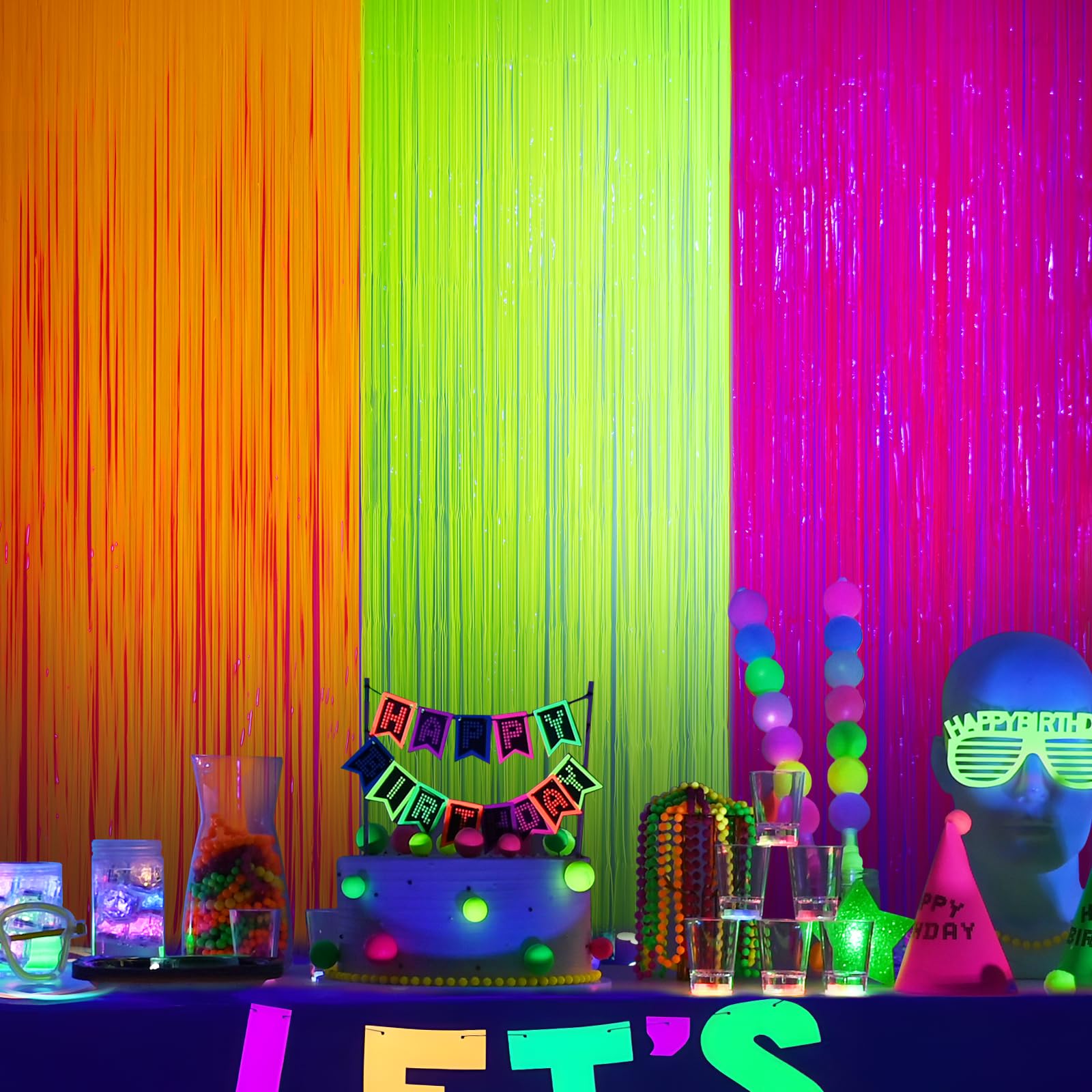 Caractéristiques : Matériau : feuille réactive aux UV. 3 couleurs fluo, grande couverture – Comprend 3 rideaux en orange macaron, jaune et fuchsia. Parfait pour tout thème de fête : idéal pour les fêtes lumineuses, les anniversaires, les fêtes dansantes, les fêtes d'enfants, les raves, les nuits néon, ou comme cabine photo lumineuse ou décoration murale. Il suffit de décoller et de coller Durable, léger et réutilisable, c'est une façon amusante et festive d'ajouter du mouvement, de la couleur et de l'excitation à votre décoration de fête. Urne Anniversaire 3 Rideaux à Franges Métalliques Noir - Décoration Brillante Pour Fête, Mariage, Anniversaire Boule A Facette Dimensions (chaque rideau) : 1 m (l) x 2 m (H) Quantité : lot de 3., Effet lumineux : fluorescent sous UV/lumière noire. Sous la lumière noire, ces rideaux prennent vie, créant un effet vibrant et lumineux que vos invités vont adorer. Organisez une soirée Fluo et phospho avec VegaooParty ! Déco néon et decoration phosphorescente pour briller dans le noir, vaisselle, déco de salle, déco de table... Pliable pour un rangement facile et réutilisable pour votre prochaine célébration phosphorescente. Avec des couleurs macaron orange vif, jaune et fuchsia, chaque rideau mesure 1 x 2 m, ce qui les rend parfaits pour les portes, les murs ou les toiles de fond de cabine photo. Installation facile à décoller et à coller : chaque rideau est livré avec une bande adhésive pré-attachée solide pour une suspension rapide et facile. Rideau Franges Phosphorescent Simpkeely Fournitures De Fête Phosphorescentes – Lot De 3 Rideaux à Franges Phosphorescents Rideau à franges en aluminium orange fluo | France Effect Réutilisable et léger : fabriqué à partir d'un matériau durable, non toxique, léger et résistant aux déchirures.