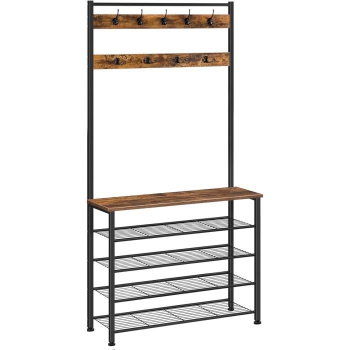 Les grilles métalliques servent à ranger vos chaussures, telles que baskets, mocassins, pantoufles, bottines, sandales, chaussures à talons, etc. ESituro Porte Manteau avec 5 Étagères, Portant à Vêtement avec Étagère Garde-robe 3 en 1 : Avec ce vestiaire ouvert, vous pouvez suspendre des manteaux ou des robes sur la tringle, mettre des chaussures sur le porte-chaussures à 2 étagères et ranger pantalons, boîtes, sacs sur les tablettes ou dans les compartiments latéraux Dressing Chambre Adulte Portant Vêtements Avec Deux étagères Penderie D'entrée Style Industriel Portemanteau H182cm Portant Chaussures Rangement Porte à chaussures à 2 niveaux Matériaux de haute qualité ESituro Tringle à Vêtement avec Étagère de Rangement, Penderie Murale... Idéal pour chambre à coucher, penderie, entrée, couloir, etc. Polyvalent Ce porte-manteau multifonctionnel n'occupe que 0., 03m², mais il offre plus de possibilités d'organiser vos objets et facilite le choix de vos vêtements ou chaussures à la volée. Couleur. Chêne Clair Noir · Marque. eSituro · Taille. 100 cm x 30 cm x 165 cm · Poids de l'article. 22,2 Kilogrammes · Style. Industrial · Assemblage requis. Oui Les patins du meuble d'entrée sur pied évitent de se glisser et de rayer le plancher. La surface lisse ne raye pas les vêtements. Vous pouvez l'installer où vous le souhaitez. Parfaites pour ranger les vêtements pliés tels que les T-shirts, les jeans, les pulls, les livres, les boîtes de rangement, les chapeaux, etc. Décoratif et compacte : Grâce à sa forme compacte et à l'association du bois et du métal, ce porte vêtements sur pied apportera une touche d'élégance à votre pièce tout en prenant peu de place.