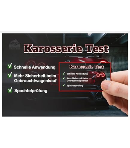 Sa pointe magnétique permet de détecter les repeints et accidents cachés avec une précision de 20 microns. La forme stylo est pratique à transporter - je l'ai... 🚗 ✅ Testeur de mastic facile : ce vérificateur de carrosserie est fait rapidement. Le principe est très simple : si la carte reste sur la peinture = non enduite ; la carte tombe = carrosserie enduite Testeur Carrosserie Magnétique Lux-In GmbH Carte Magnétique Pour Un Test Rapide De La Carrosserie (spatule Détecteur Réparation Carrosserie Voiture 🚗 ✅ Peinture magnétique pour voiture : la carte magnétique est environ aussi grande qu'une carte de visite traditionnelle et peut donc être rangée dans le portefeuille et vous l'avez à portée de main à tout moment Description du produit [Affichage convivial] La barre d'indication de couleur indique l'épaisseur du vernis en micromètres, ce qui facilite l'évaluation des couches de peinture et de mastic. [Conception efficace] la jauge compacte de style stylo permet des tests rapides et précis, parfait pour les ateliers de carrosserie automobile et les amateurs de bricolage. [Flexibilité magnétique... 🚗 ✅ Vérificateur de peinture électrique extra puissant : pour vérifier la carrosserie des voitures d'occasion, aucun testeur de peinture électrique coûteux n'est nécessaire. 100 x Carré magnétique adhésif 0,9 mm x 20mm x 20mm, 100 unité, force 80 g/cm² | Shop
