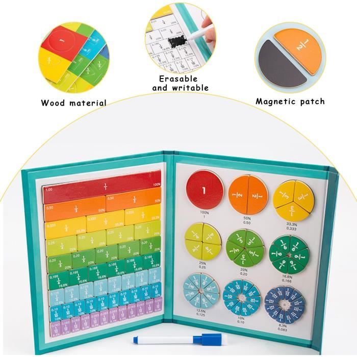 60 PIÈCES-Carreaux Magnétiques Pour Enfants, Jouets Préscolaires, Tige De Construction, Blocs De Différentes couleurs permettent des combinaisons individuelles pour créer de nouvelles équations. Filtre Anti-allergènes Fractions Circulaires Magnétiques : 51 Fractions Aimantées De 1 à 1/12 Fraction Montessori Un stylo réutilisable et facilement effaçable est également inclus. Votre enfant rencontre des difficultés avec les fractions ? · 🧲 Démonstration Réelle et Compréhension Profonde · 📐 Compréhension des Numérateurs et des... Livre de fractions magnétiques pour enfants, ensemble de puzzle éducatif, carreaux de fractions et cercles, kit d'apprentissage des manipulations... Léger et confortable à tenir, il est non seulement pratique pour les présentations éducatives sur tableaux blancs ou noirs magnétiques, mais aussi facile à utiliser et à apprendre pour les enfants. Jeux pour apprendre les fraction est un excellent moyen d'apprendre et de développer des compétences pratiques. 【Tuiles Avec Fractions Magnétiques】Le puzzle éducatif de fractions magnétiques des fractions est adapté à divers environnements d'apprentissage, de la salle de classe à la maison, répondant à divers besoins d'apprentissage et aidant les enfants à comprendre les concepts mathématiques. 【Fraction Magnetique】Contient 10 tuiles et 10 cercles magnétiques, soit un total de 110 pièces, avec 10 segments magnétiques à code couleur. 【Jeu De Fractions】Ce livre de démonstration sur les fractions magnétiques est amusant et encourage le jeu avec votre enfant, vous permettant de l'aider à apprendre et à interagir avec lui. Description du produit Spécifications: Type de produit:Fraction Magnetique Matériau: Mousse EVA Nombre d’unités:1 Dimensions: 22,2 x 18,3 x 1,7 cm Couleur:Coloré Caractéristiques:Développe la patience et satisfait la curiosité Poids: 350 g Contenu: 1 * Fraction Magnetique Avertissement De Sûreté NO