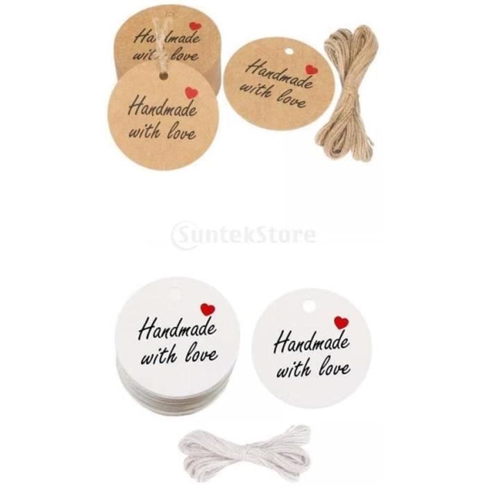Le papier offre une sensation épaisse et robuste qui résiste aux déchirures et à la flexion, assurant que vos étiquettes conservent leur forme et leur présentation. Chaque étiquette est pré-perforée avec un petit trou, permettant à la ficelle incluse de passer rapidement et facilement. Taille pratique : parfaitement dimensionnée pour plus de polyvalence, chaque étiquette circulaire faite maison pour pâtisseries mesure 3 cm de diamètre. Touche personnelle : Chaque étiquette fabriquée avec l'amour présente la phrase attachante « Handmade With Love » avec un charmant motif de cœur rouge sur un côté, ajoutant instantanément de la chaleur à n'importe quel article. TIESOME Etiquettes de vêtements, 100Pcs Etiquettes de nom à repasser Application facile : conçues pour une utilisation sans effort, ces étiquettes cadeaux marron disposent d'une surface d'écriture lisse compatible avec divers outils tels que les stylos, les crayons et les encres. Matériau : papier + corde. 100 pièces étiquettes cadeaux rondes papier fête faveur suspendues pour... En outre, ils servent de décorations élégantes pour des occasions spéciales, y compris les cadeaux de mariage, les décorations de fête d'anniversaire, les cadeaux de vacances et les projets de scrapbooking. Corde : 0,1 cm (diamètre) x 20 m (longueur par rouleau)., Couleur : marron. Ce design convivial simplifie le processus de fixation des étiquettes sur des bocaux, des boîtes, des sacs ou des cadeaux emballés. Etiquette Cadeau Kraft Lot De 100 étiquettes Rondes En Papier Kraft De 3 Cm Et Ficelle De Jute étiquettes Cadeaux Papier Marron Ces étiquettes rondes de 3 cm sont idéales pour Noël, la Saint-Valentin, Thanksgiving, la Fête des Mères, la Fête des Enfants et bien d'autres occasions. Simples et élégantes, ces étiquettes cadeaux mettent en valeur vos créations et font de vos présents des cadeaux uniques Cette dimension compacte mais remarquable garantit que les étiquettes améliorent vos travaux manuels, bougies, savons ou emballages cadeaux faits maison sans les submerger.