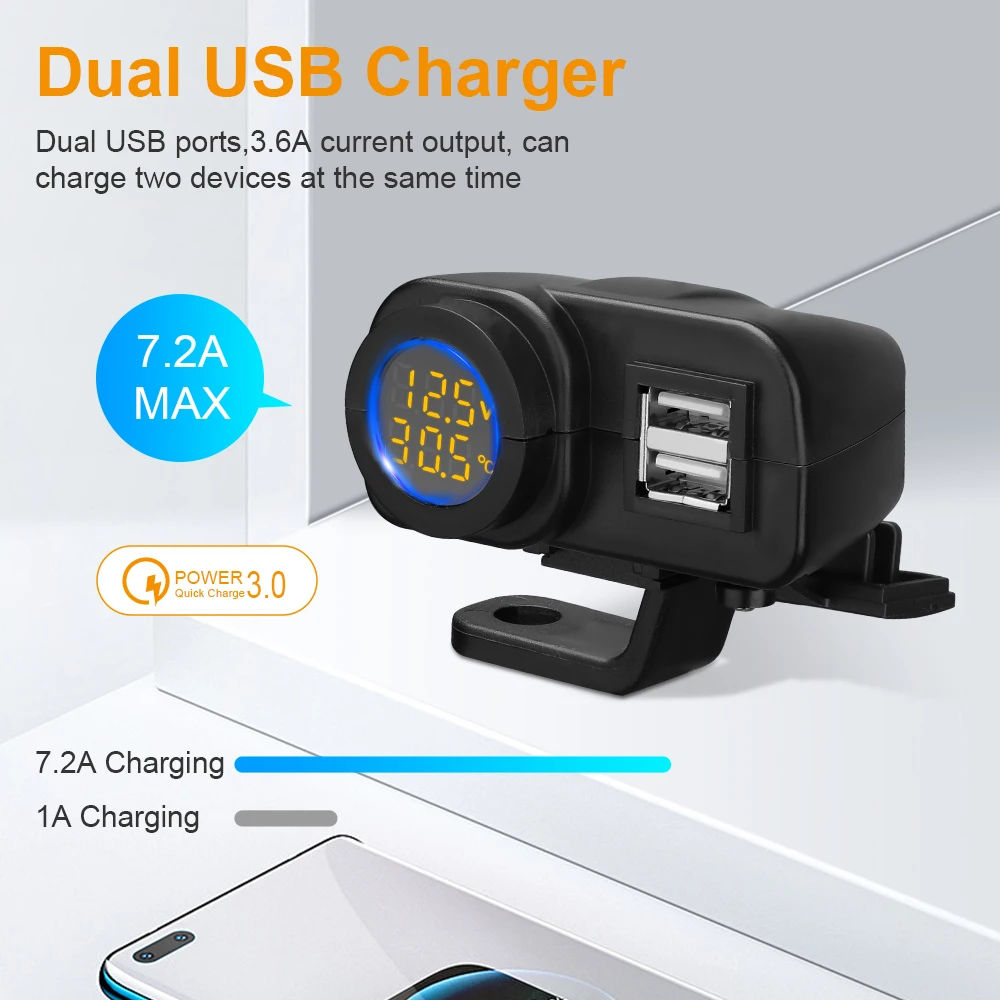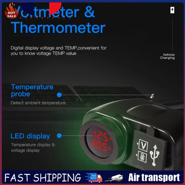 Tension d'entrée : 12 V-24 V CC. - Convient pour charger GPS, iPhone, PSP, téléphones portables et autres appareils numériques. - Puce intégrée à microprocesseur intelligent et fusible pour une protection contre les surintensités. Caractéristiques : - Il s'agit d'un chargeur USB très fiable de 12 V/24 prises de courant., - Interrupteur étanche. Chargeur de moto double USB : ce chargeur est spécialement conçu pour les motos et dispose de deux ports USB pour charger facilement plusieurs appareils simultanément. Puissance de sortie USB : DC 5 V 2,1 A. Chargeur Moto Chargeur Double USB Pour Moto, Voltmètre, Thermomètre, Affichage Numérique, Prise De Chargeur De Téléphone Portable, Allume-cigare De Voiture, 3.0 Chargeur USB Moto Voltmètre Thermomètre Voltmètre Numérique Moto Chargeur USB Moto Avec Voltmètre Et Thermomètre - Double Port Étanche 5V 4.2A - Guidon 22-25mm Accessoire Moto étanche - Revêtement en caoutchouc entièrement fermé résistant à l'eau et à la poussière. Sortie : DC 5 V 4,2 A (2,1 A + 2,1 A)., Dimensions : voir photo., Certification : CE RoHS., Compatibilité : guidon φ22–25 mm. 【Étanche et 】Conçu avec un interrupteur étanche et un couvercle en caoutchouc entièrement fermé, ce chargeur est résistant à l'eau et à la poussière. L'écran numérique affiche la tension et la température pour tout contrôler. Installation simple sur la plupart des motos 12V-30V. Certifié CE pour une... - Design d'éclairage intelligent, pas besoin de le transporter. 【Design intelligent et caractéristiques de sécurité】Le chargeur est équipé d'une puce microprocesseur intelligente et d'un fusible pour protéger contre les surintensités. Il fournit une source d'alimentation fiable avec une sortie maximale de 2 A (2,1 A + 2,1 A), une charge efficace et rapide. Ashata Adaptateur de chargeur double USB pour moto Adaptateur Universel... Il est conçu pour résister à diverses conditions météorologiques et une longue durée de vie. Il dispose également d'une résistance aux hautes températures et d'une résistance, charge stable et sûre. - Design compact pouvant être monté sur presque toutes les surfaces.