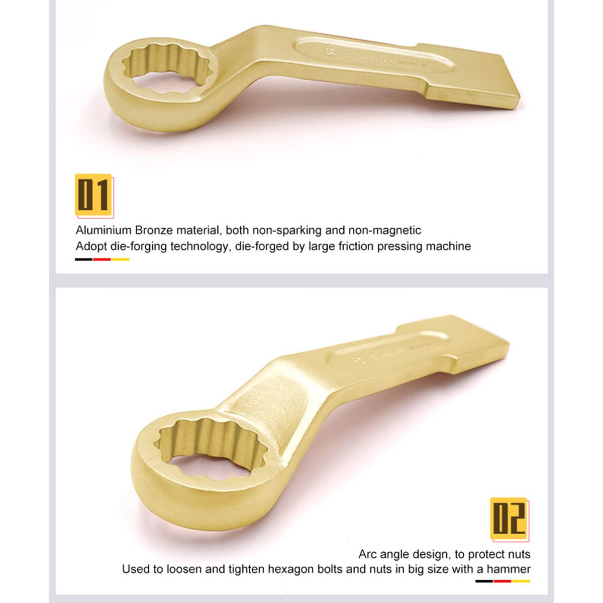 Clé à oeil à frapper 27mm antidéflagrant al-br Sécurité et professionnelle : l'aluminium bronze/le cuivre béryllium peut efficacement éviter les étincelles qui apparaissent pendant qu'il y a une friction ou un choc entre les outils et les pièces de travail, pour éviter une explosion inflammable et garantir la propriété nationale et la sécurité personnelle. Outil Anti-étincelles Pour Zones Explosibles WEDO Clé à Frapper Métrique à Oeil 41mm,sans étincelles Clé Annulaire Clé Certifiée Gs Bam Largement utilisé dans la pétrochimie, la production d'huile, la production de gaz, les tuyaux d'huile et de gaz, la génération d'énergie, l'exploitation minière, le plastique, les fibres chimiques et d'autres industries. Description Salut les bricoleurs et pros ! Voici la clé à œil à frapper WEDO, un vrai costaud en acier chromé 40 CRV. Avec ses 41mm d'ouverture et sa longueur de 225mm, elle offre un super levier. Le design bi-hexagonal 12 pans et la tête inclinée en arc de cercle protègent vos écrous et augmentent la durée de vie de l'outil. Parfaite pour les gros travaux en marine, mécanique... HAZET 2872FS-24 Clé annulaire ouverte à 2 faces de frappe et hexagonale... Clé à frapper en aluminium bronze/cuivre béryllium non étincelle forgée sous pression, haute dureté, couple fort, entièrement conforme à la norme DIN allemande. Service : WEDO TOOLS a été très apprécié par nos nouveaux et anciens clients en raison de notre concept de design convivial, l'amélioration continue de l'excellente qualité et des services après-vente. Bronze béryllium adapté pour un fonctionnement à l'hydrogène avec une concentration inférieure à 21 %, code standard GB Ex IIC, dureté HRC30-40., Application : clé à frapper en aluminium bronze/cuivre béryllium non étincelle utilisée pour le serrage, l'assemblage et le démontage des tuyaux et des pièces d'arbre. Matériaux bruts de haute qualité : aluminium bronze non étincelles, convient pour un fonctionnement avec une concentration en éthylène inférieure à 7,8 %. Pour améliorer la satisfaction des clients, nous avons mis en place des centres de service en Allemagne, en Russie, en Corée du Sud, à Singapour, au Canada, aux États-Unis, aux Émirats arabes unis afin de fournir un service après-vente en temps opportun. Décalage profond à 45 degrés pour éliminer efficacement les obstacles.
