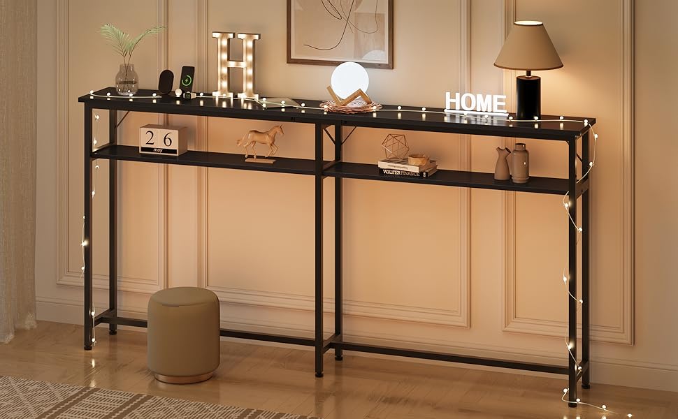 Console Industrielle Métal MDF Table Console Haute étroite Avec Grille - 60 X 30 X 60 Cm - Brun Table Basse Derrière Canapé Longue Table aluminium escalier 2 plateaux - Présentoir 2 niveaux alu Table console étroite, 180 x 23 x 100 cm, à 2 étages, avec espace de rangement, extra longue, pour entrée, salon, noire ; Actuellement indisponible. Nous ne... Console à 2 étages avec espace de rangement La hauteur entre les deux étagères est de 17 cm et offre suffisamment d'espace pour ranger des objets. Stable et durable, pieds réglables Le cadre en métal et les étagères en panneau de fibres à densité moyenne de haute qualité améliorent la stabilité et maintiennent l'équilibre. Elle est assez longue pour étendre votre canapé et offre beaucoup d'espace pour les photos, les décorations, les lampes, les tasses, les livres et plus encore. Matériaux de qualité supérieure Cette console au style industriel élégant est durable et facile à nettoyer. Cette longue table basse à 2 niveaux offre beaucoup d'espace pour présenter des objets, garde l'essentiel à portée de main et ajoute de l'espace de rangement à votre salon ou votre salon. Stable et durable : la table console avec espace de rangement est fabriquée avec un cadre en fer de haute qualité avec 2 couches de peinture et des panneaux MDF, qui sont robustes, durables et résistants aux rayures, augmentent la stabilité et augmentent la capacité de charge jusqu'à 45 kg. Facile à assembler : manuel d'instructions détaillées (français non garanti), les accessoires et les outils sont inclus et chaque accessoire est marqué pour une installation facile. Espace de rangement idéal]La table console est dotée d'un plateau de 100 x 30 cm (L x l) pour offrir suffisamment d'espace pour exposer vos livres, photos...