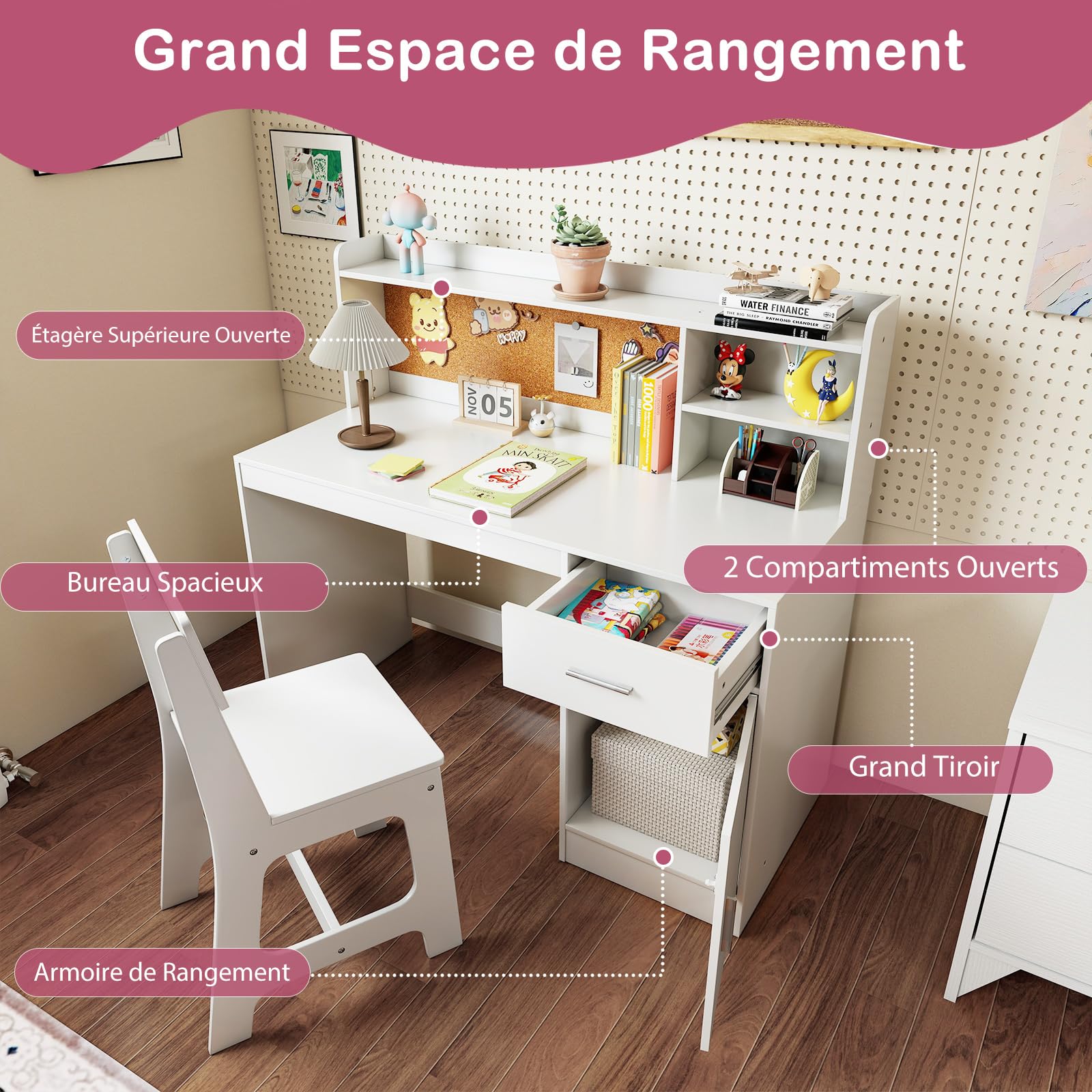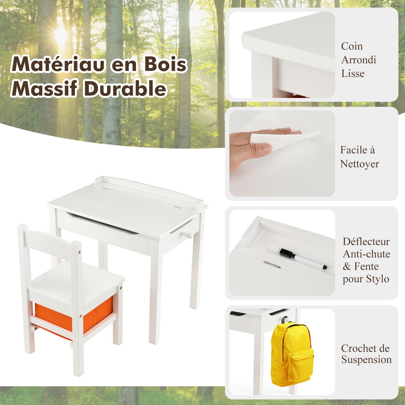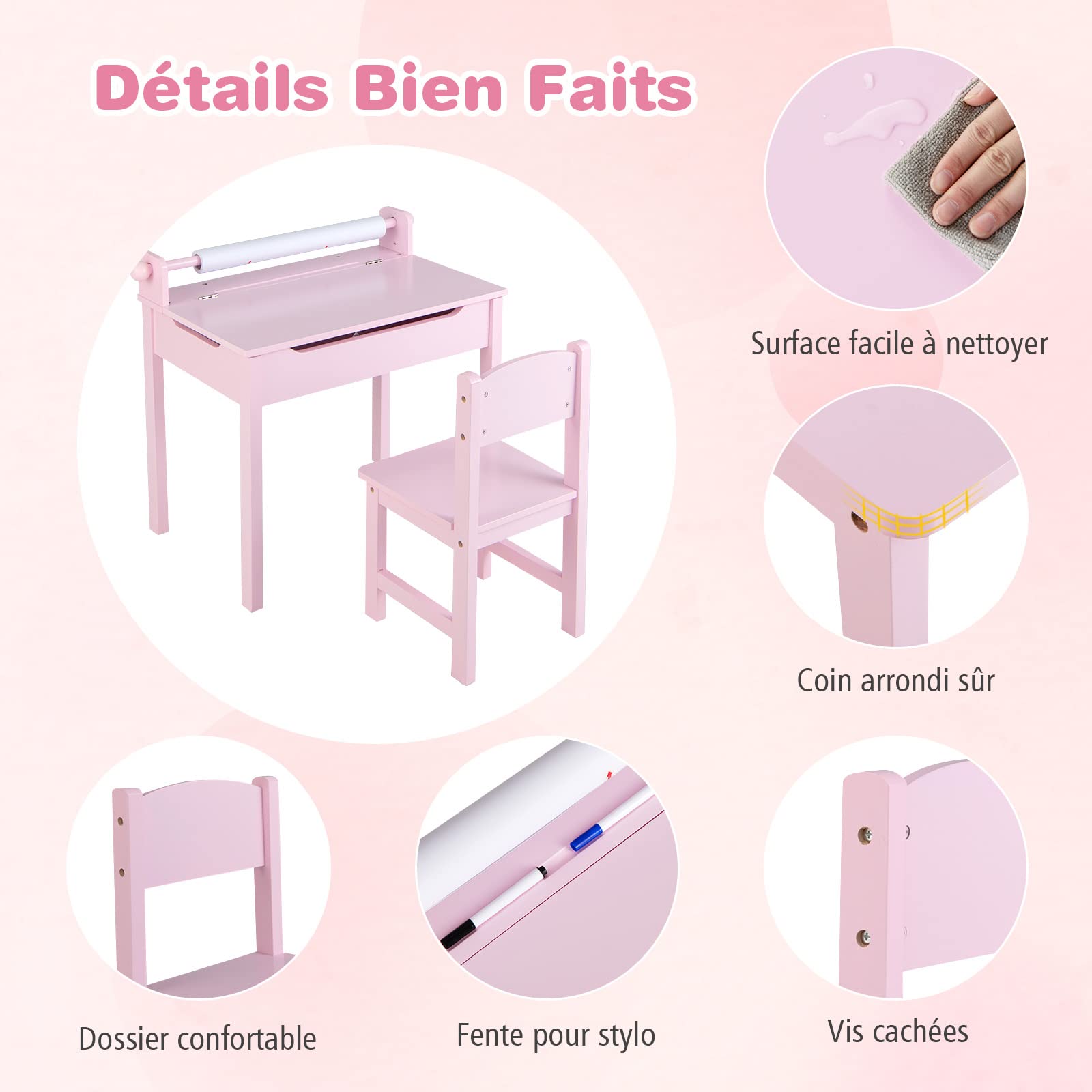 Caractéristiques : Structure en bois massif garantit une bonne capacité de charge Charnière de sécurité pour une utilisation sûre Conçu avec des rainures humanisées pour éviter les blessures ou les pincements de doigts Boîte de rangement intégrée offrant un espace de rangement supplémentaire Équipé d'un crochet pour accrocher les sacs à dos ou les bouteilles d'eau des enfants Emplacement intégré pour stylo pour placer les stylos et les crayons de manière pratique Barrière surélevée empêchant efficacement les objets de tomber du bureau Dossier confortable de la chaise aidant les enfants à adopter une bonne posture assise Idéal pour la chambre des enfants, la salle de jeux, l'étude, le salon, la crèche, la salle de classe, etc. Design intme : Doté d'un design à table incliné, il y a un grand espace de rangement sous le plateau pour aider les enfants à développer une bonne habitude... Fabriqué en bois massif et MDF, ce bureau enfant assure stabilité, capacité de charge élevée (70kg pour la chaise) et durabilité. De plus, la chaise est équipée d'une boîte de rangement intégrée pour que les enfants puissent organiser leurs affaires. Bureau Enfant 2 Ans Bureau Enfant Avec Chaise, Table D'Étude Enfant Avec Planteau Incline Rangement Integree Crochet Charge 60kg Pour 3 Ans Marron 98891778 Table Enfant Ergonomie pour 3 ans+ : Hauteur idéale, dossier haut et siège large de la chaise favorisent une bonne posture. Description : Cet ensemble de bureau et de chaise à table basculante est un merveilleux cadeau pour votre enfant en pleine croissance ! Design sûr et pratique : Doté d'un plateau incliné, l'ensemble a un grand espace de rangement sous le plateau (utile pour développer l'organisation des enfants). Un crochet latéral permet en outre de suspendre sac à dos ou bouteille d'eau, évitant le désordre autour de la table., Polyvalence et assemblage simple : Cette table enfant avec chaise offre un espace confortable pour la lecture, l'écriture, le dessin, les jeux ou les repas. La fente pour stylo intégrée et le crochet de sac à dos sur le côté sont conçus pour réduire le désordre et maintenir la zone d'étude propre et rangée. Fabriqué en bois massif et en MDF sélectionnés, cet ensemble de bureau et de chaise pour tout-petit est durable et stable. Bureau d'étude avec chaise pour enfants à hauteur réglable rose - 4 (O... Le plateau est facile à basculer grâce aux charnières de sécurité et à la poignée découpée humanisée. Lorsqu'il n'est pas utilisé, la chaise se range sous le bureau pour économiser de l'espace, idéal pour les pièces petites. GOPLUS Bureau Enfant avec Chaise en Bois de Pin, Table a Dessin