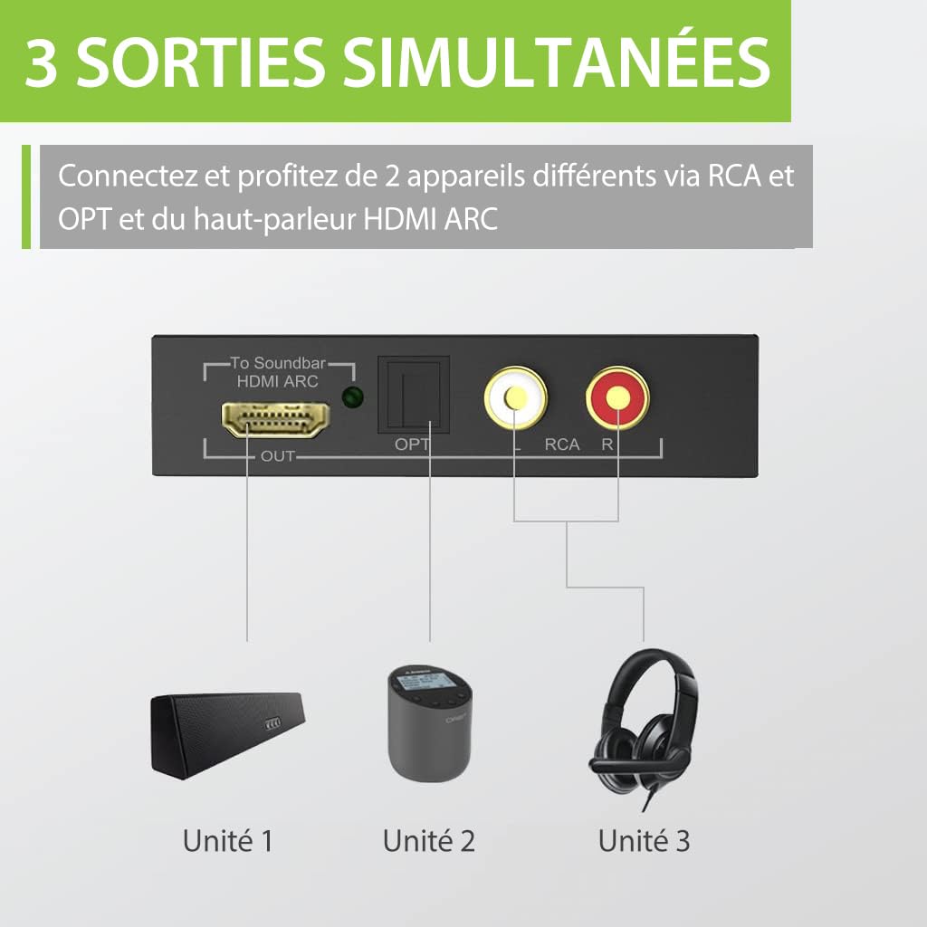 Sortie Audio Double Optique RCA Guide De L'utilisateur Du Convertisseur Audio HDMI ARC Avantree HAX05 Adaptateur Jack Optique Cet adaptateur permet d'extraire l'audio d'une télévision compatible HDMI ARC et de le transmettre à une barre de son ou à un autre système audio. Avec sa conception compacte et sa facilité d'utilisation, le HAX05 est idéal pour les systèmes de home cinéma et les applications multimédias Avantree Ensemble - Casque TV sans Fil Compatible avec Télévision avec Veuillez noter qu'il ne fonctionne pas directement avec le HDMI des PS4/PS5/Blu-ray. Avantree Orbit Pro - Éetteur Bluetooth pour TV avec Sortie Audio HDI... Interface conviviale La conception intuitive du HAX05 vous aide à connecter facilement vos câbles d'entrée et de sortie. Extraction audio HDMI ARC Le HAX05 décompose les signaux audio numériques de votre téléviseur HDMI ARC et convertit le signal audio HDMI extrait en un format stéréo analogique (AUX 3,5 mm) ou en optique numérique (SPDIF) pour une flexibilité ultime. Deux sorties audio simultanées La compatibilité HDMI ARC vers RCA du HAX05 le rend déjà unique, mais sa capacité à produire à la fois de l'audio numérique (optique) et analogique (RCA / AUX) est ce qui le distingue vraiment. HDMI ARC Pass Through Même si le port HDMI ARC de votre pé par une barre de son compatible, vous pourrez toujours diffuser de l'audio simultanément vers des écouteurs Bluetooth grâce à la fonction traversante du HAX05., Vous pourrez profiter d'une sortie audio fluide et simultanée sur des écouteurs sans fil (connectés à un émetteur Bluetooth) et sur votre barre de son externe, afin que les
