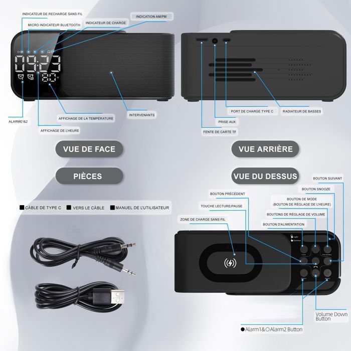 ciciglow Réveil Numérique, Double Réveil LED avec Haut Disposant de toutes les fonctions essentielles d'un réveil : alarme, snooze, affichage de la température Arbore un design sobre et moderne qui s'intègre parfaitement dans tous les intérieurs Radio Réveil Chargeur Téléphone Ciciglow Radio Réveil Numérique à Double Réveil, Haut Parleur Bluetooth Fm Horloge Grand Ecran Led Chargeur Usb Pour Les Gros Dormeurs Enfant Lecture Voyage 1074017689 Radio Reveil Chargeur Tels que les smartphones, les tablettes, les ordinateurs portables et les ordinateurs, etc., 5., Chargement USB : ce haut-parleur d'horloge miroir a une batterie au lithium haute capacité de 1200 mAh, prend en charge le chargement USB, une longue durée de vie de la batterie, convient pour la chambre, le bureau, etc. 12 x 5 x 3,5 cm / 4,7 x 2 x 1,4 poucesType de stockage : prise en charge maximale de la carte mémoire 32 G (non incluse)Type de batterie : batterie au lithium (fournie avec batterie intégrée)Batterie Capacité : 1 200 mAhPuissance nominale : 3 WListe des colis :1 x haut-parleur d'alarme1 x câble de données1 x manuel d'instructionsRemarque :Mesure manuelle, veuillez autoriser quelques erreurs. Radio-réveil FM numérique LCD, Station de haut-parleur stéréo Bluetooth avec télécommande Radio... Haut-parleur d'horlogeMatériau : plastiqueTaille du produit : env. Appareils compatibles : le haut-parleur sans fil avec horloge numérique peut être connecté à n'importe quel appareil que vous possédez. Chargement USB : ce haut-parleur d'horloge miroir a une batterie au lithium haute capacité de 1200 mAh, prend en charge le chargement USB, une longue durée de vie de la batterie, convient pour la chambre, le bureau, etc., 5., 0 : haut-parleur de réveil utilisant la nouvelle puce 5., 0, la distance de transmission est plus longue, plus rapide, un signal de connexion plus stable, pour obtenir une transmission sonore de qualité CD. Tels que les smartphones, les tablettes, les ordinateurs portables et les ordinateurs, etc.