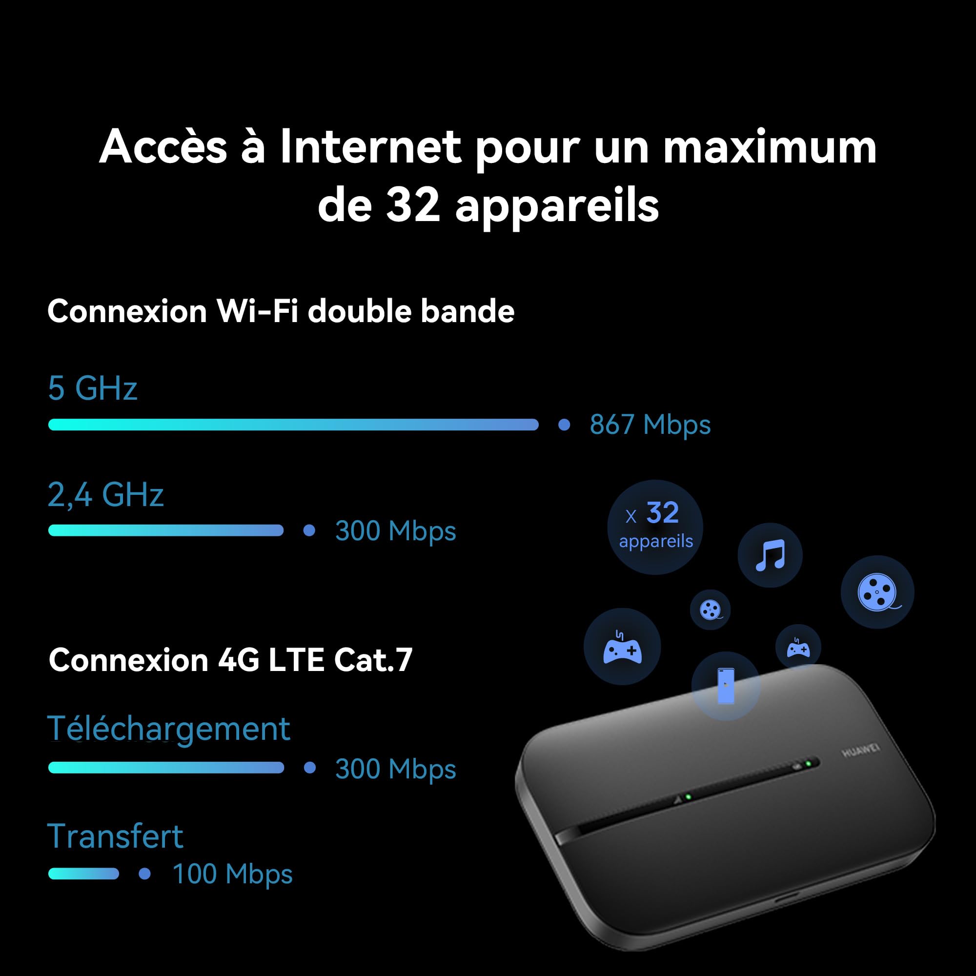 HUAWEI 4G Mobile WiFi 3 Avec Écran E5785 Routeur Mobile Portable Review Le Verdict De Notre Expert Sur La Connexion Nomade Routeur LTE 300 Mbps HUAWEI 4G Mobile WiFi 3 (with Screen), E5785, Router, Point D Routeur 4g Portable Ecran Comparez les prix pour Huawei E5785. Affichez les offres et comparez les marchands avec leDénicheur HUAWEI 4G Mobile WiFi 3(with screen) Portable Wi-Fi Anywhere You Need It: HUAWEI 4G Mobile WiFi 3 is about the width and length of a credit card, carry it in your pocket and insert a SIM card, you can enjoy the high-speed network during your trips, It is compatible with SIM cards from more than 100 countries, and this is guaranteed by years of field testing Wi-Fi portable partout où vous en avez besoin : HUAWEI 4G mobile WiFi 3 est à peu près de la largeur et de la longueur d'une carte de crédit, Portez-le dans votre poche et insérez une carte SIM, vous pouvez profiter du réseau haut débit pendant vos voyages, Il est compatible avec des cartes SIM de plus de 100 pays, et cela est garantie par des années de tests sur le terrain Le Wi-Fi double bande permet à 32 appareils de se connecter : le signal 5 GHz reste puissant même en cas d'interférences, tandis que le Wi-Fi 2,4 GHz offre une couverture plus large, Wi-Fi rapide et stable pour votre famille et vos amis,